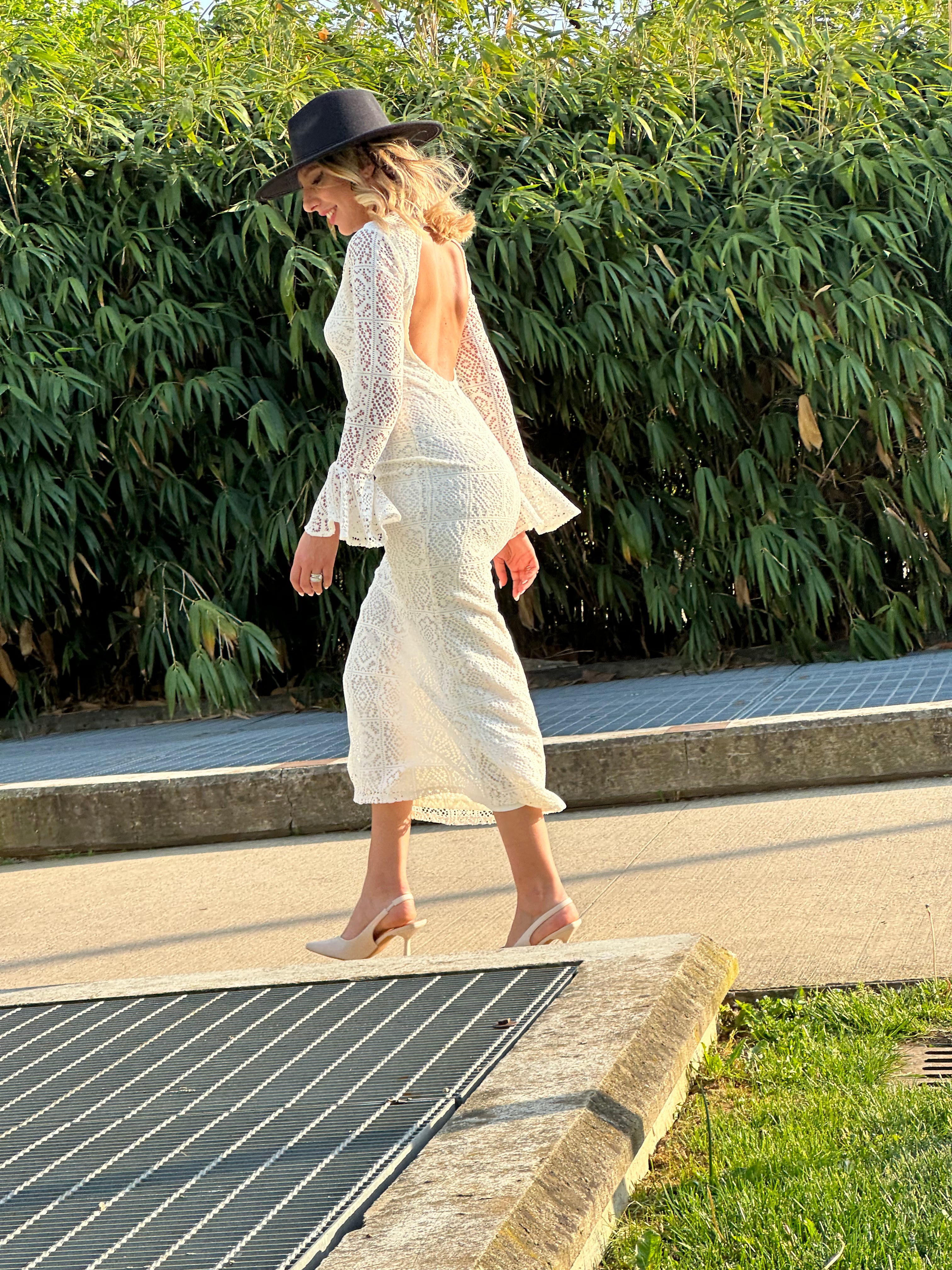 Abito lungo con doppia fodera, cerniera e scollatura dietro la schiena