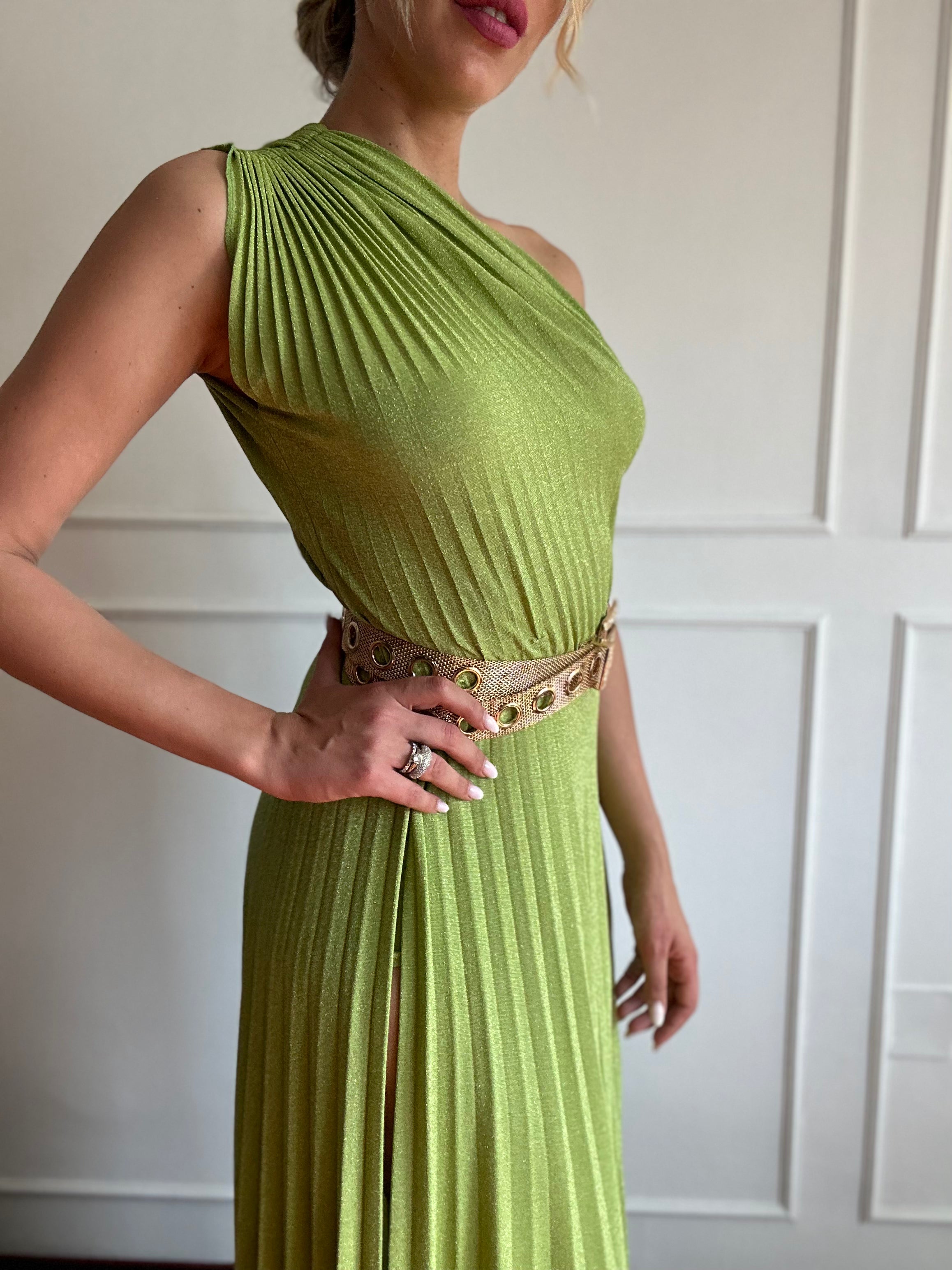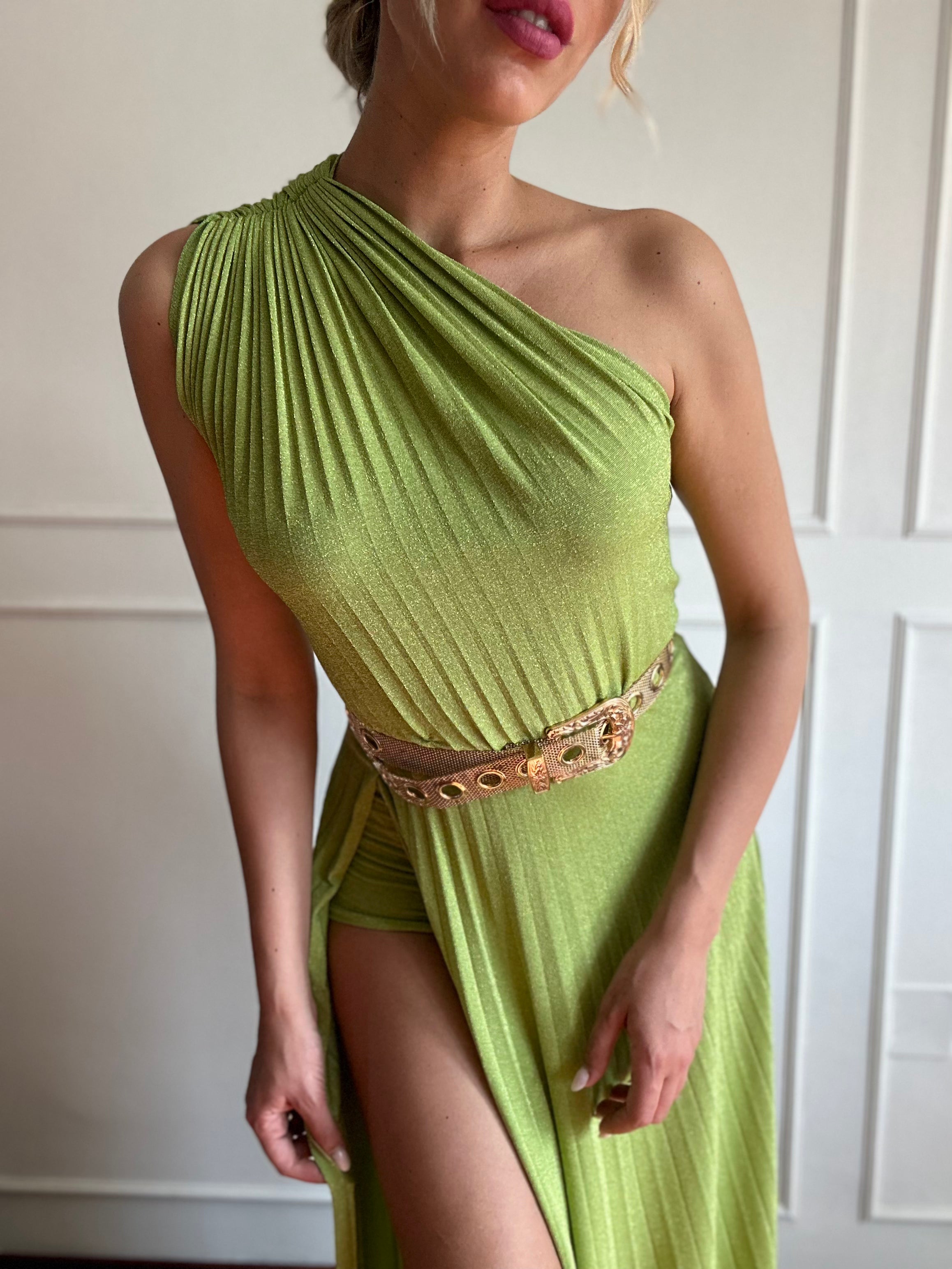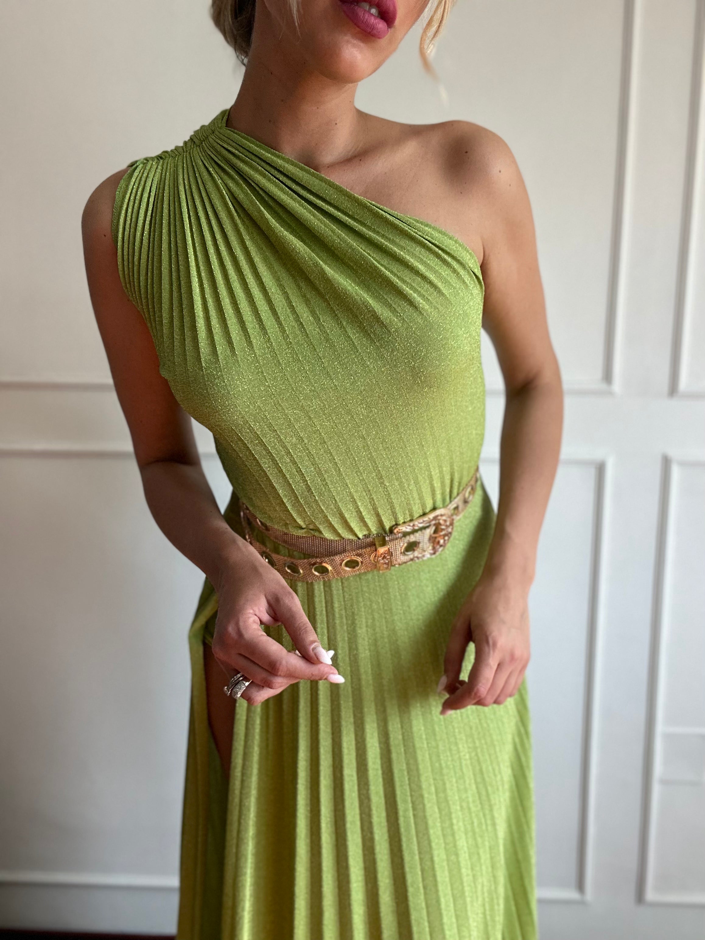 Abito plissettato con spacco laterale a sinistra , Short in tessuto e elastico in vita ,monospalla,elasticizzato ,modella h 1,75