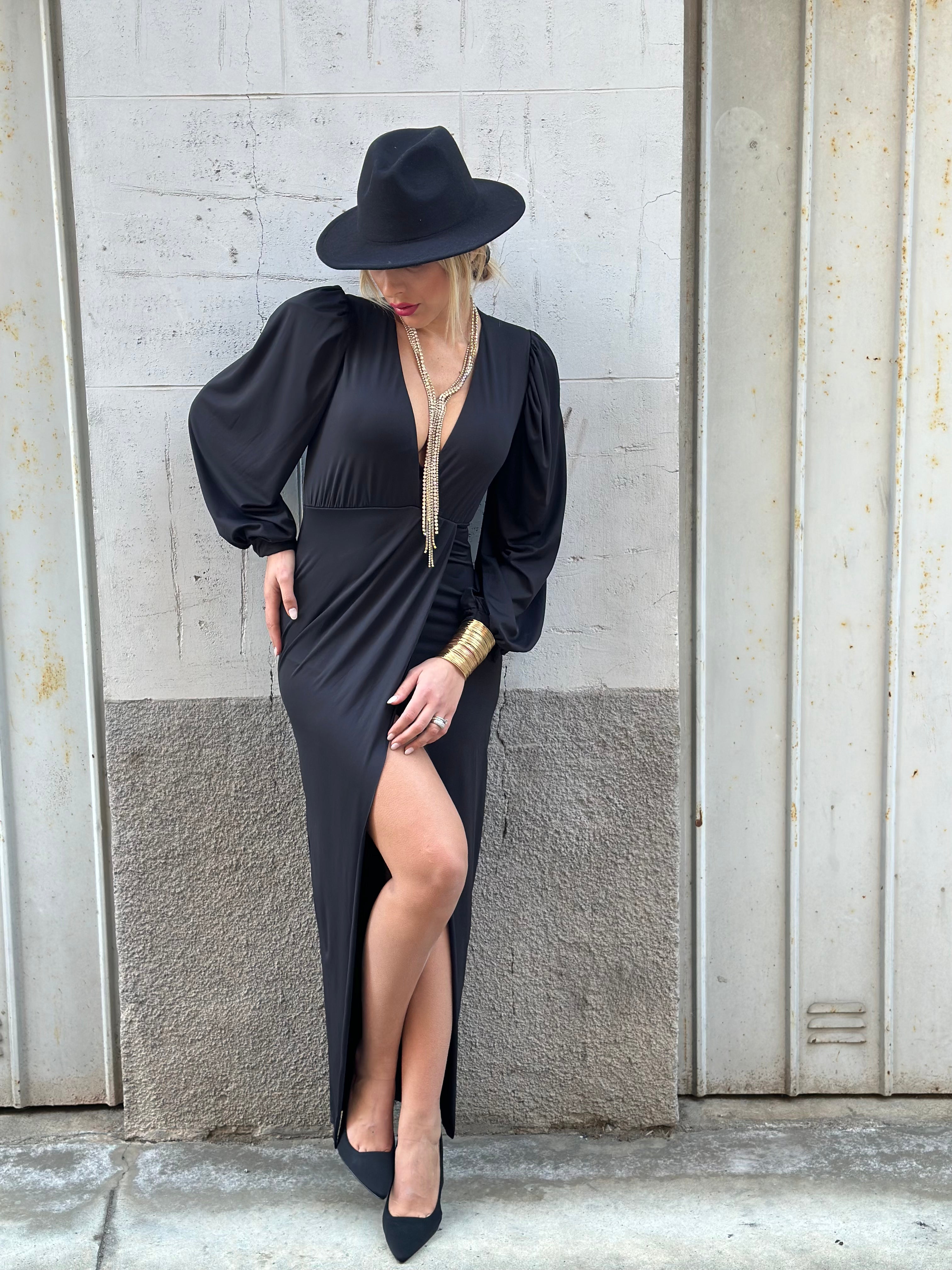 Abito lungo con spacco profondo in lycra con spalline e coppe sul seno e maniche morbide