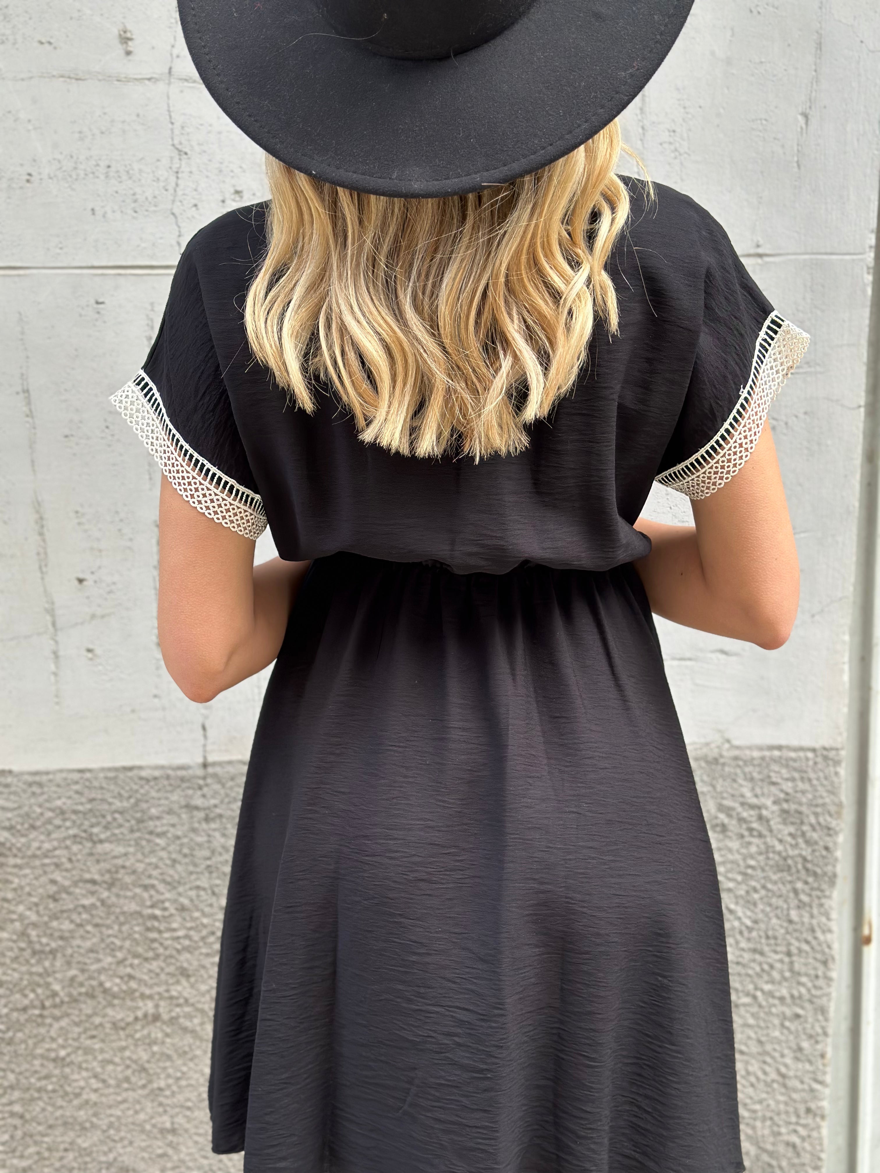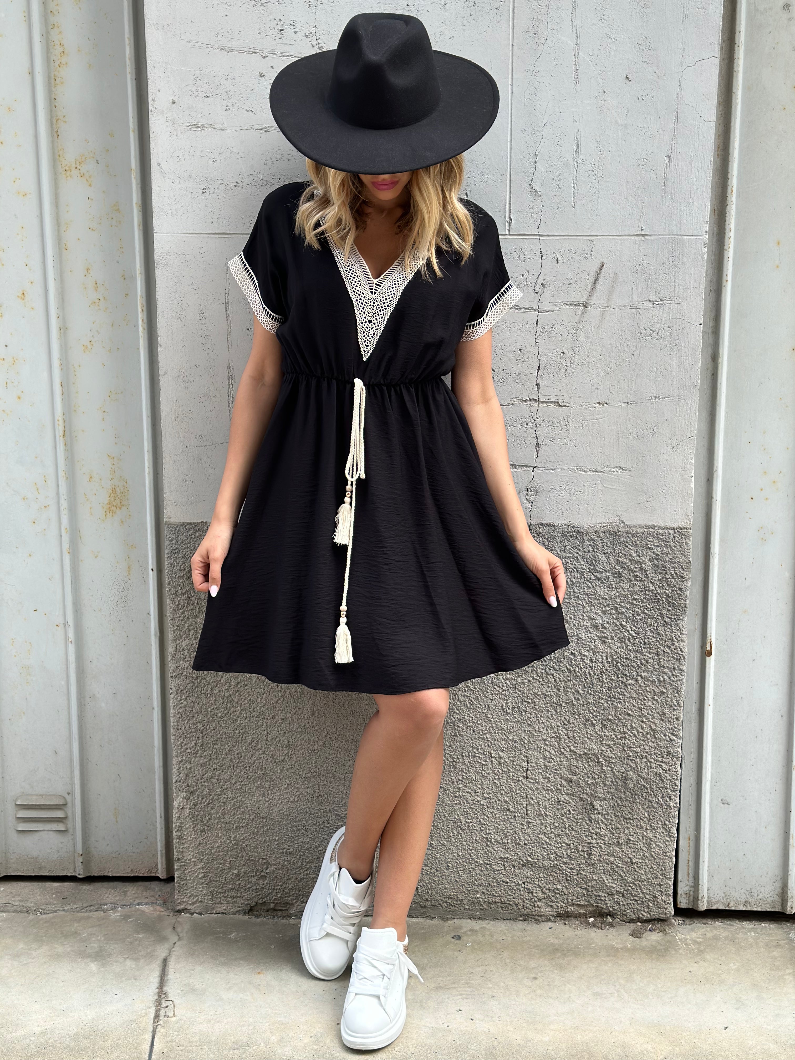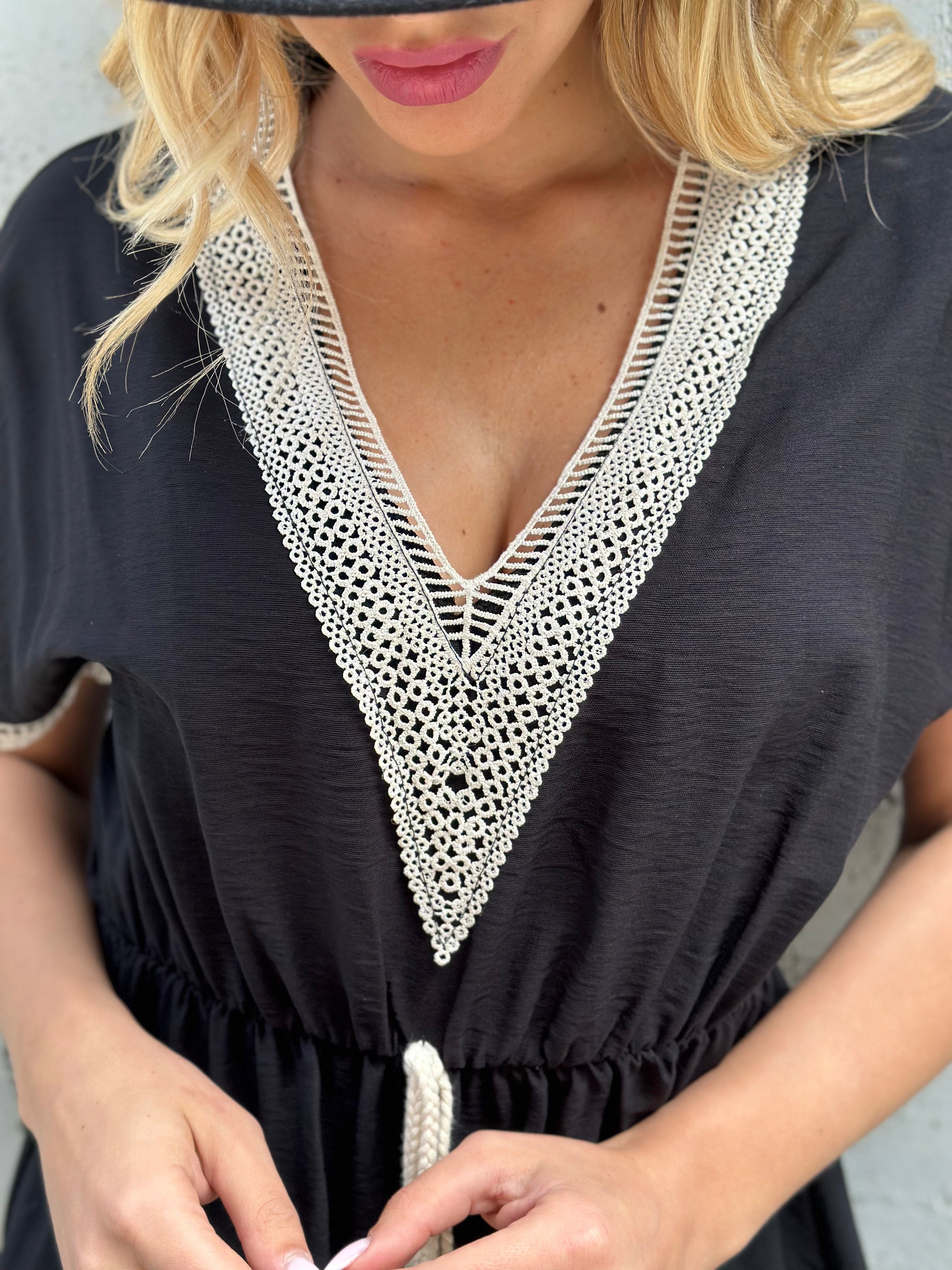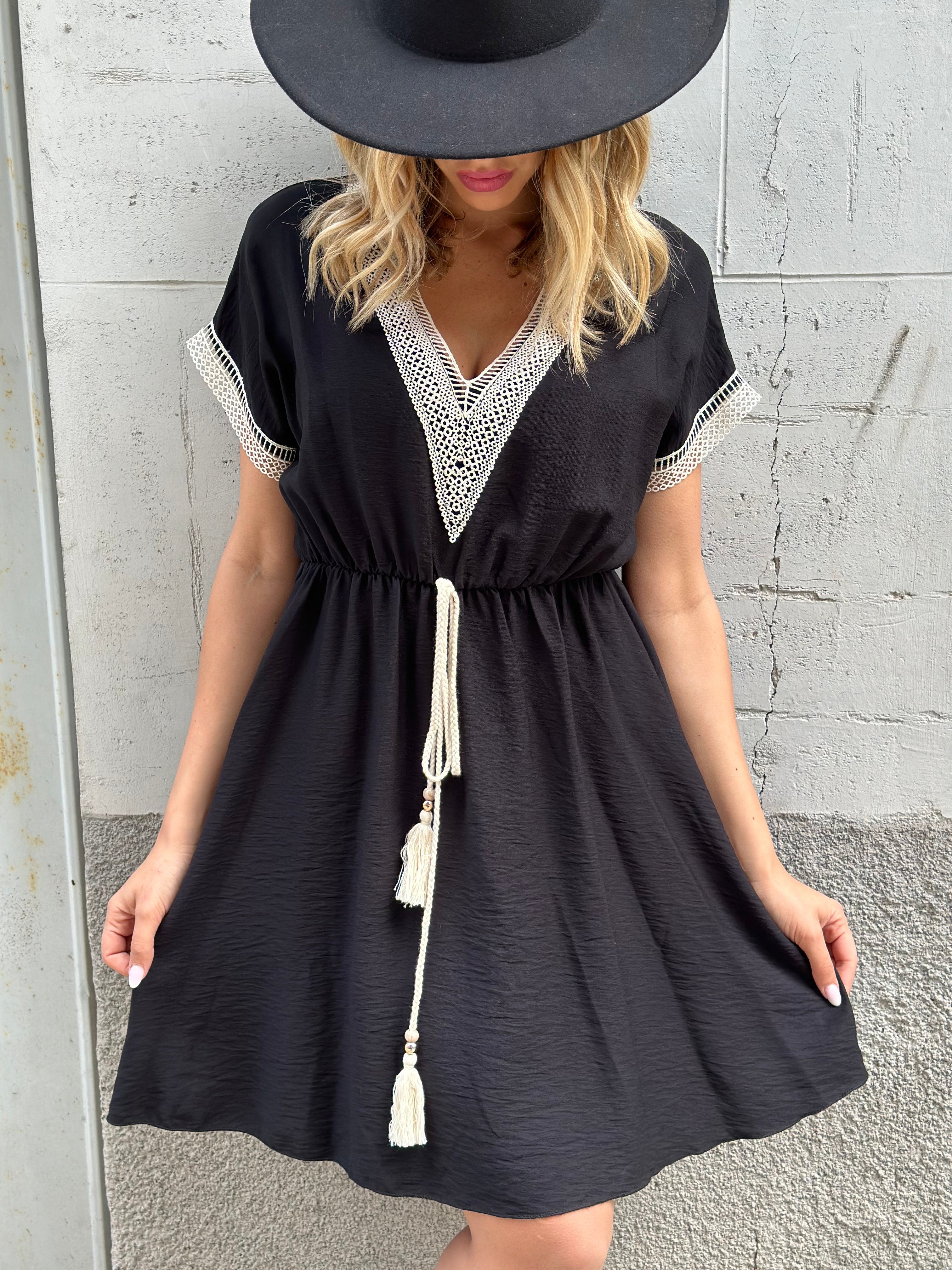 Abito con passamaneria nella scollatura e nelle maniche coulisse in vita vestibilita comoda