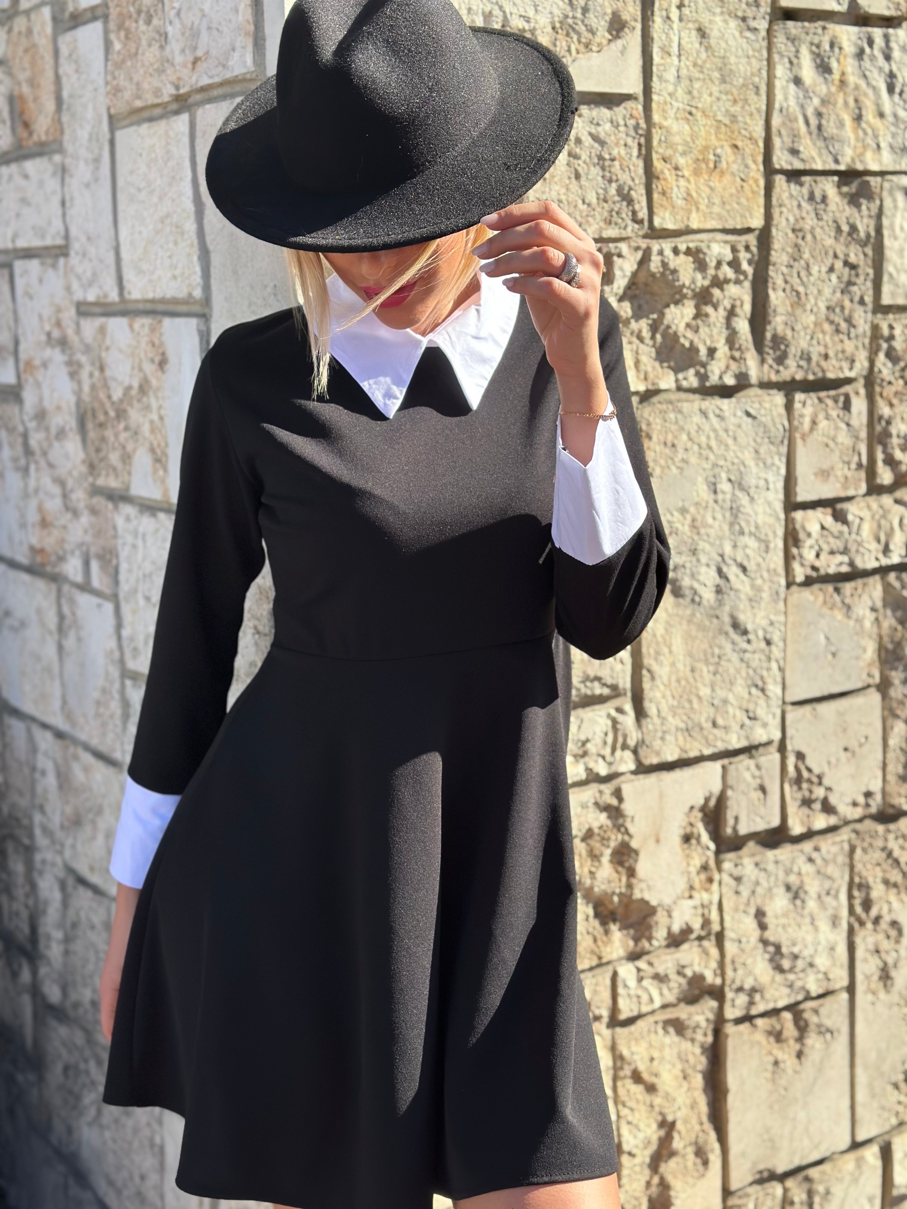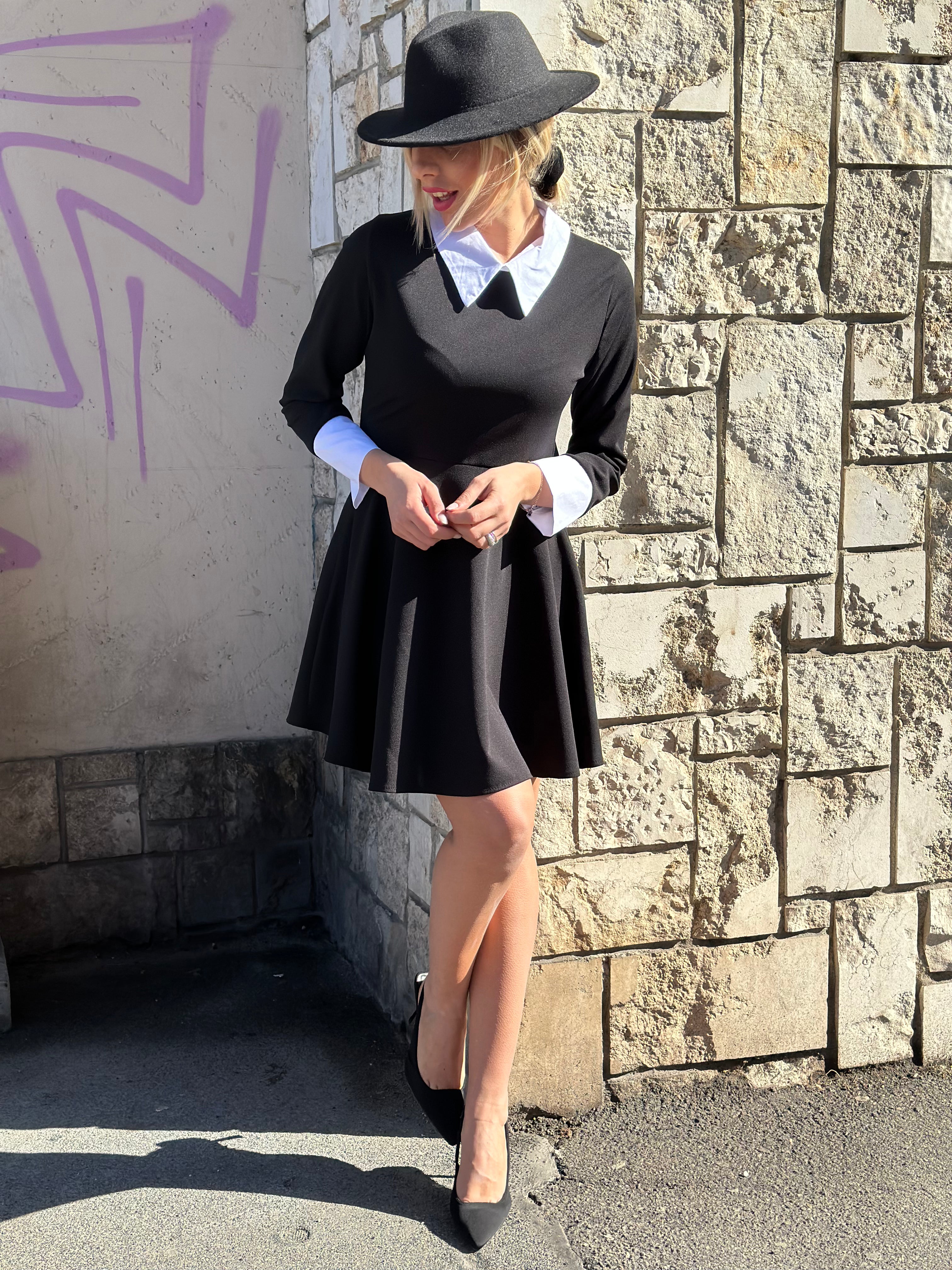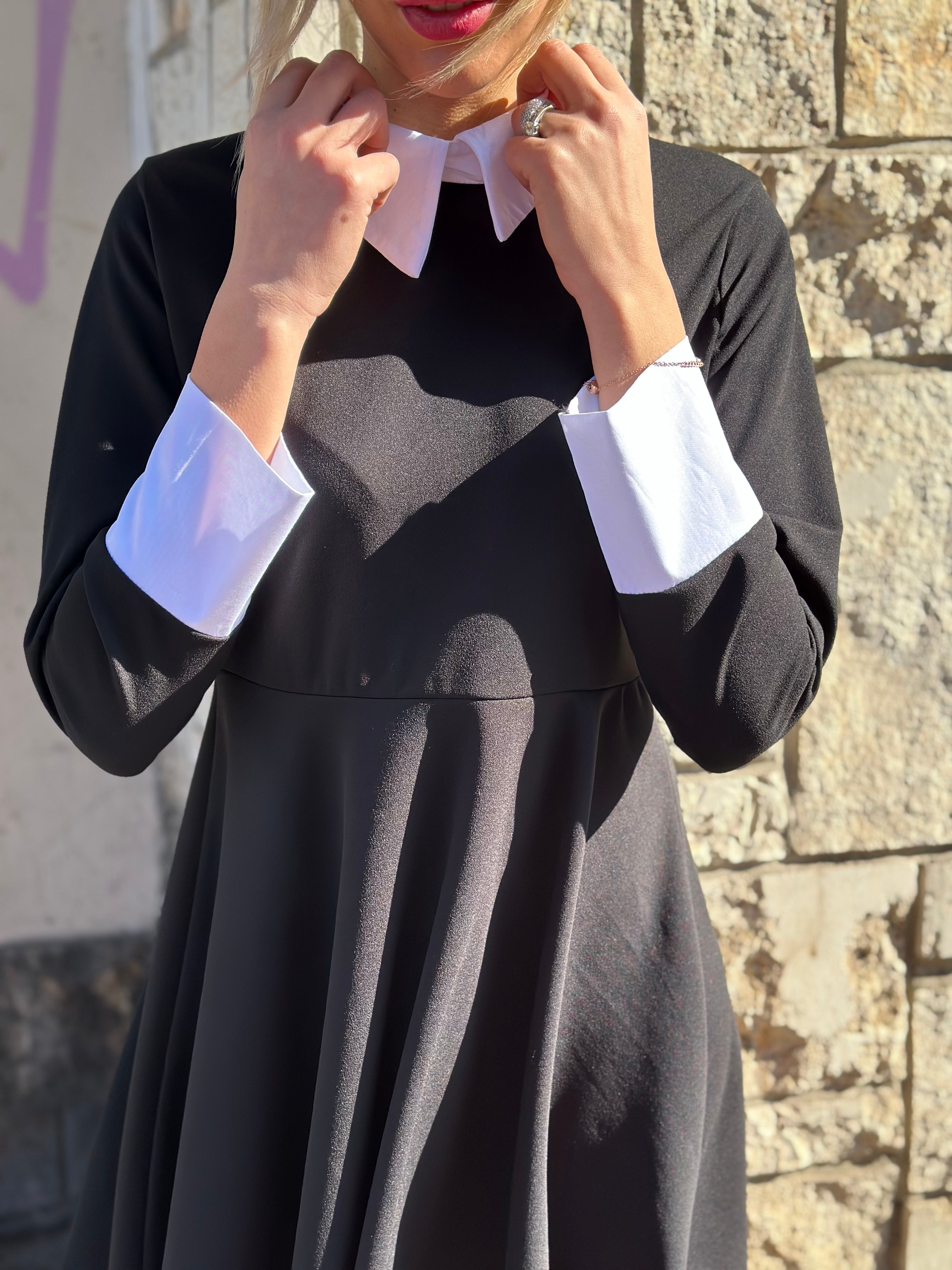 Abito corto con colletto e polsini bianchi, svasato e manica lunga