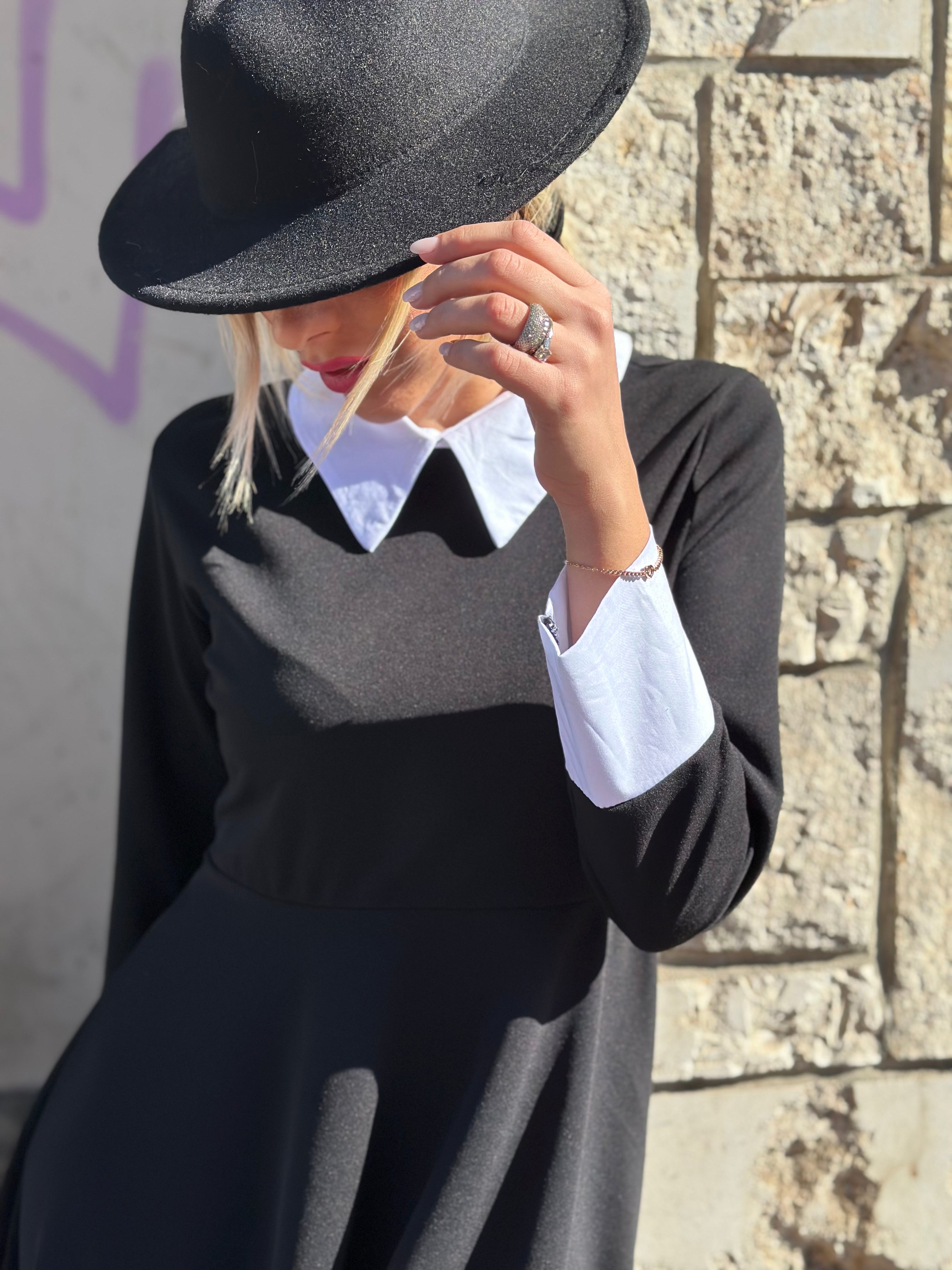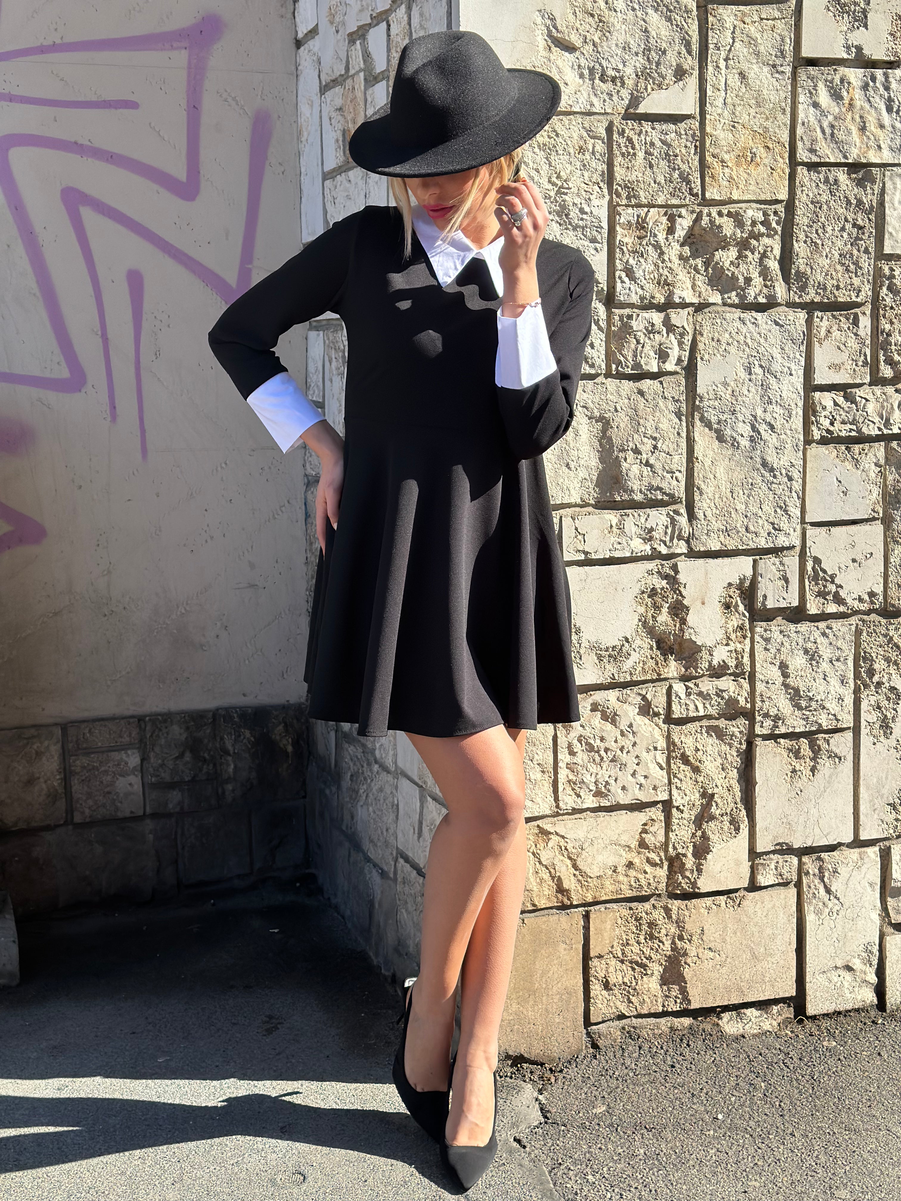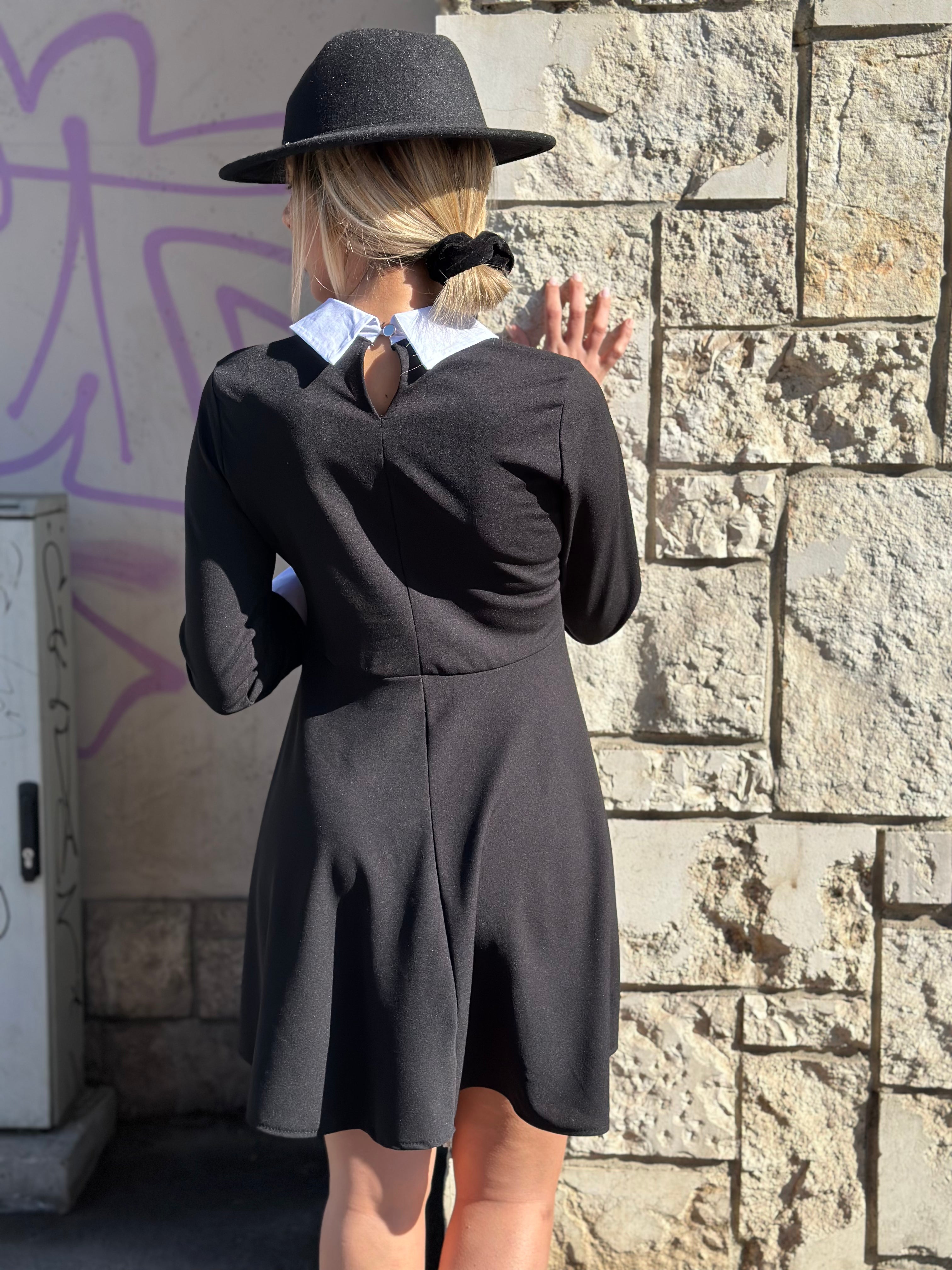 Abito corto con colletto e polsini bianchi, svasato e manica lunga