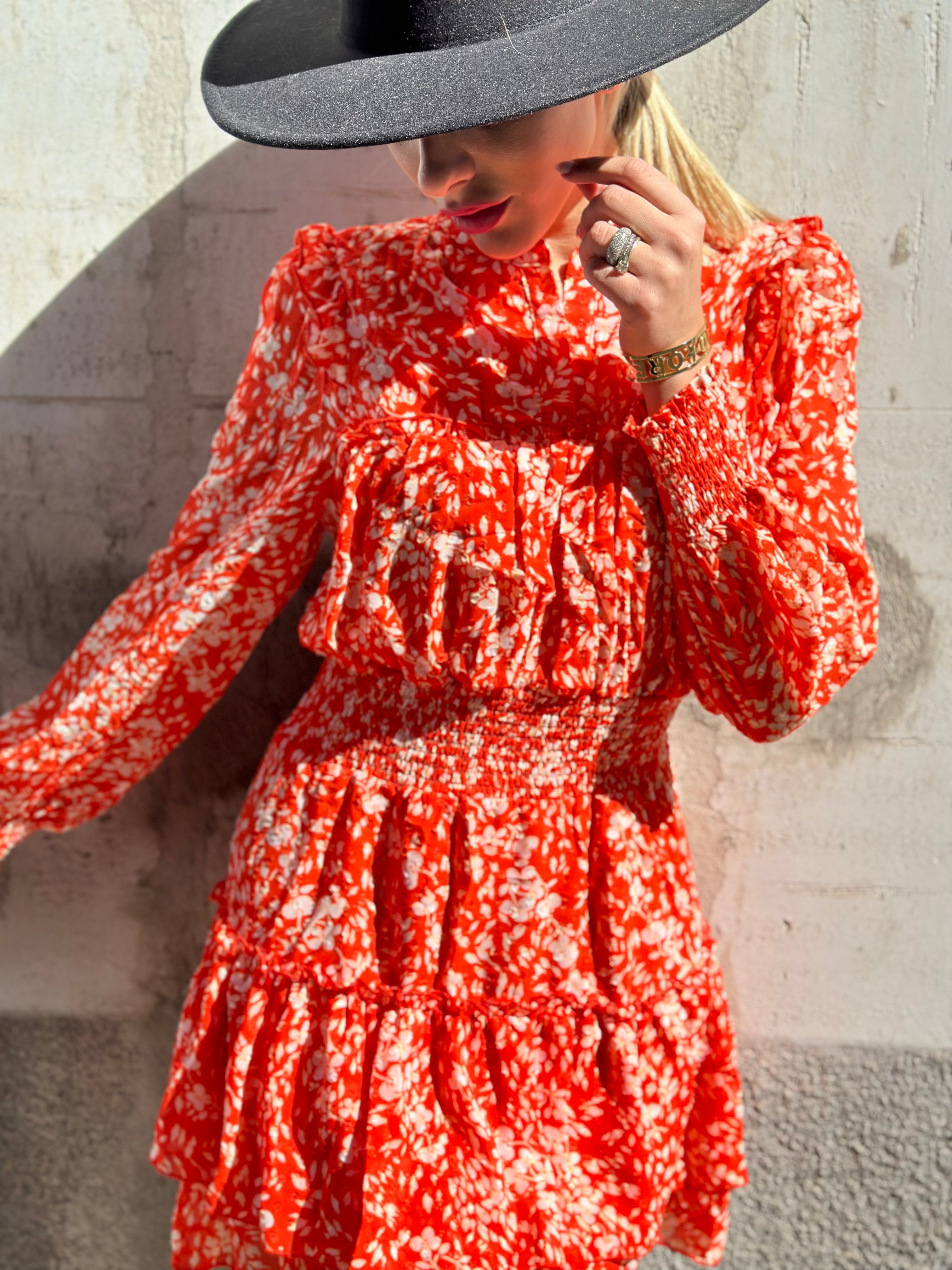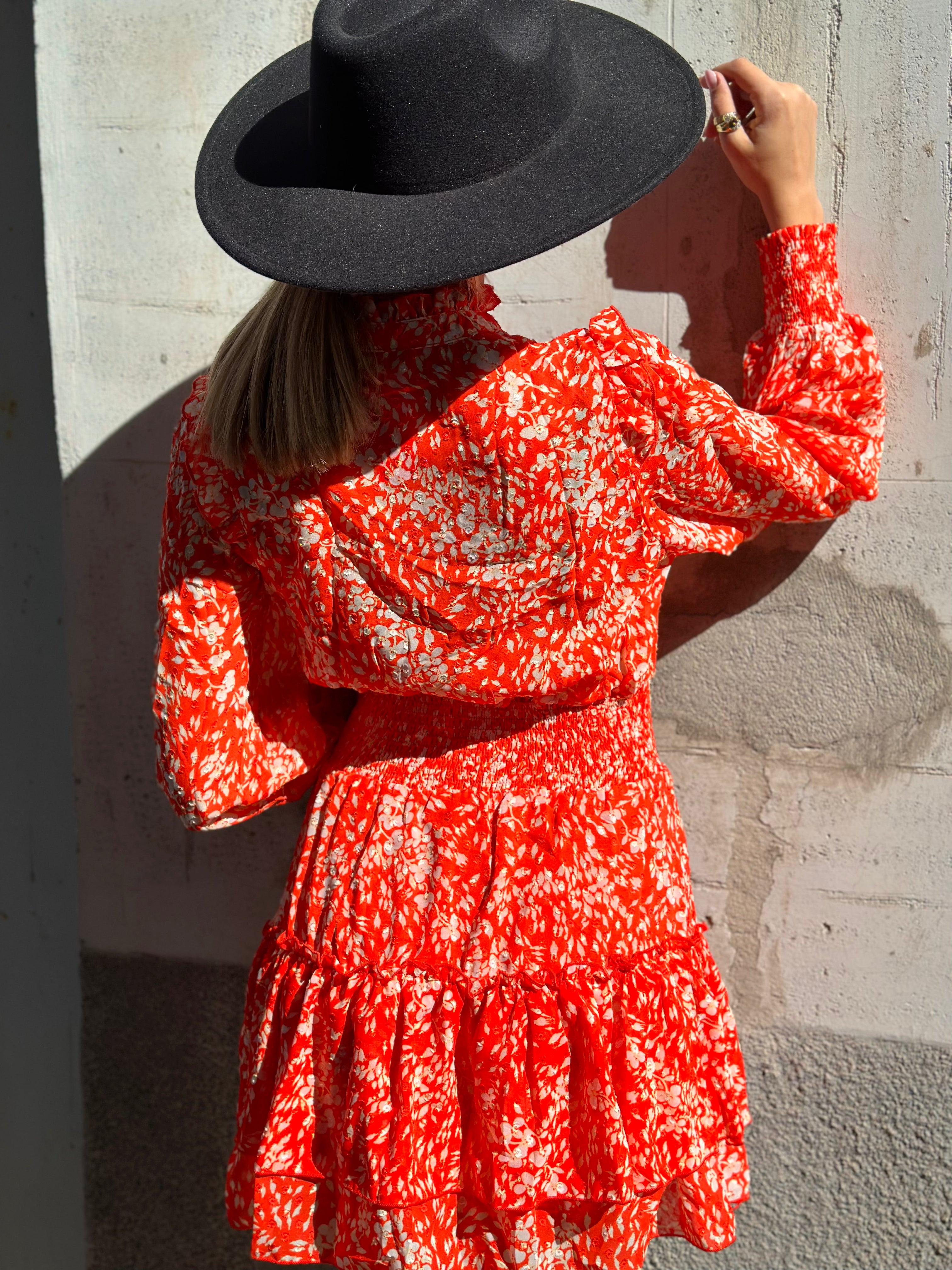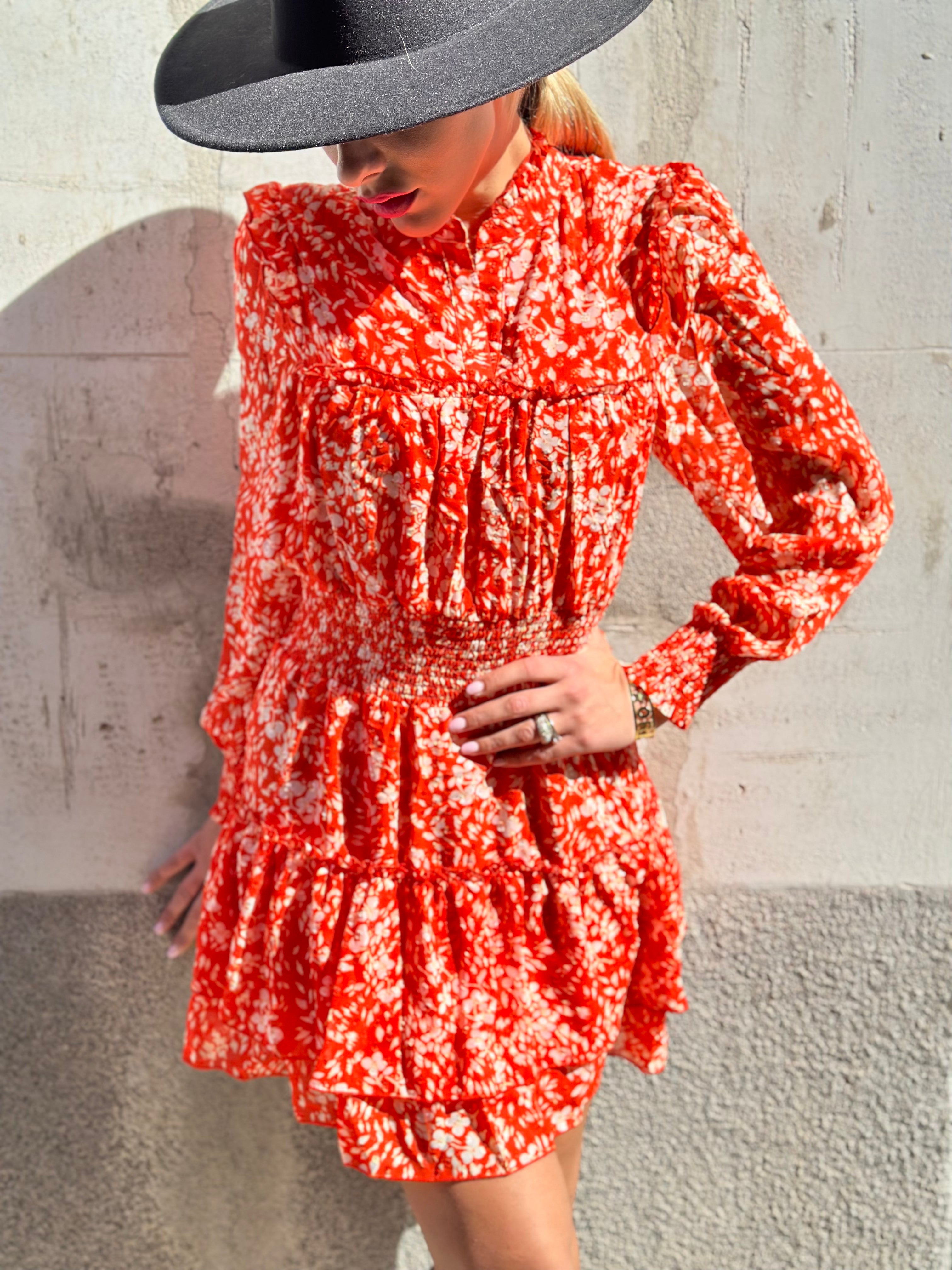 Abito corto collo coreana con balza sul fondo è arricciatura in vita