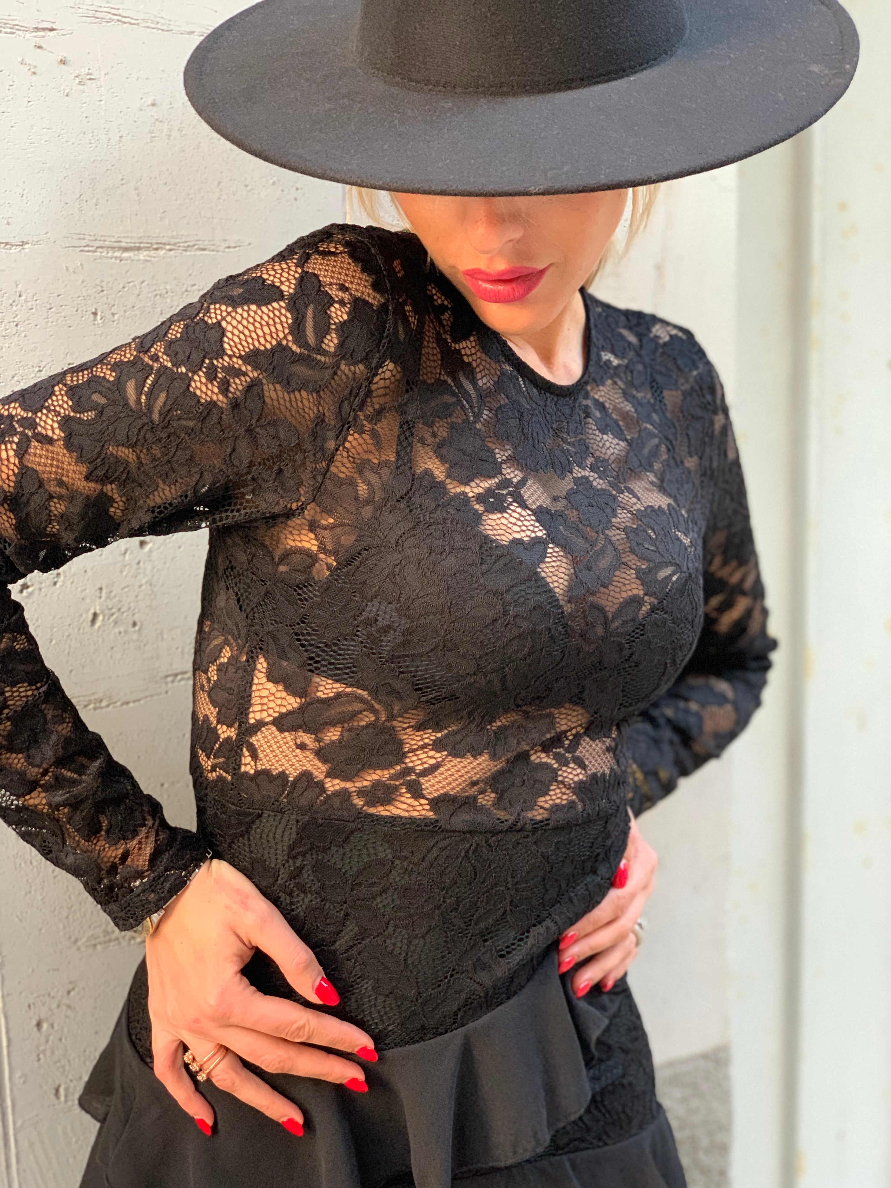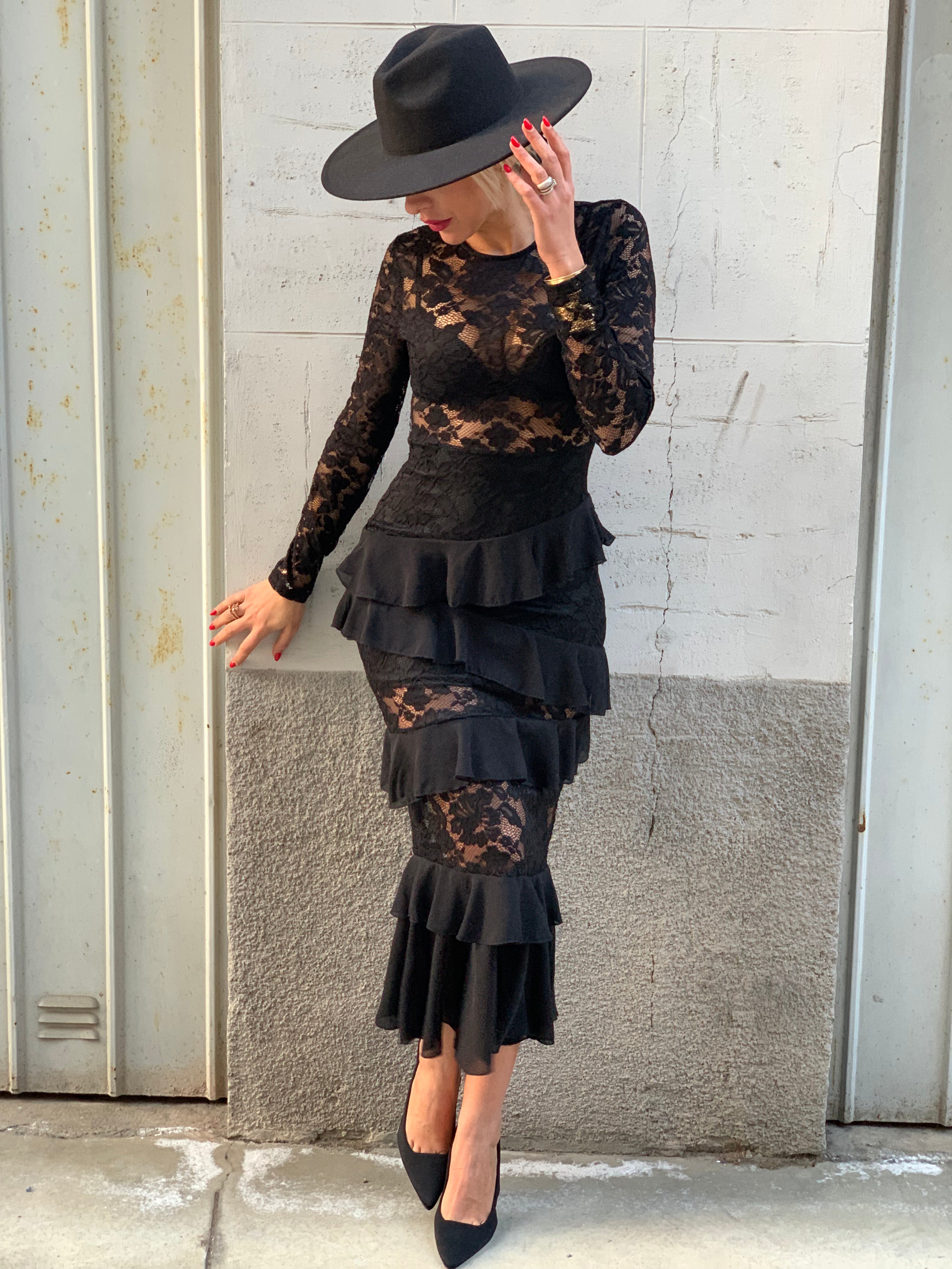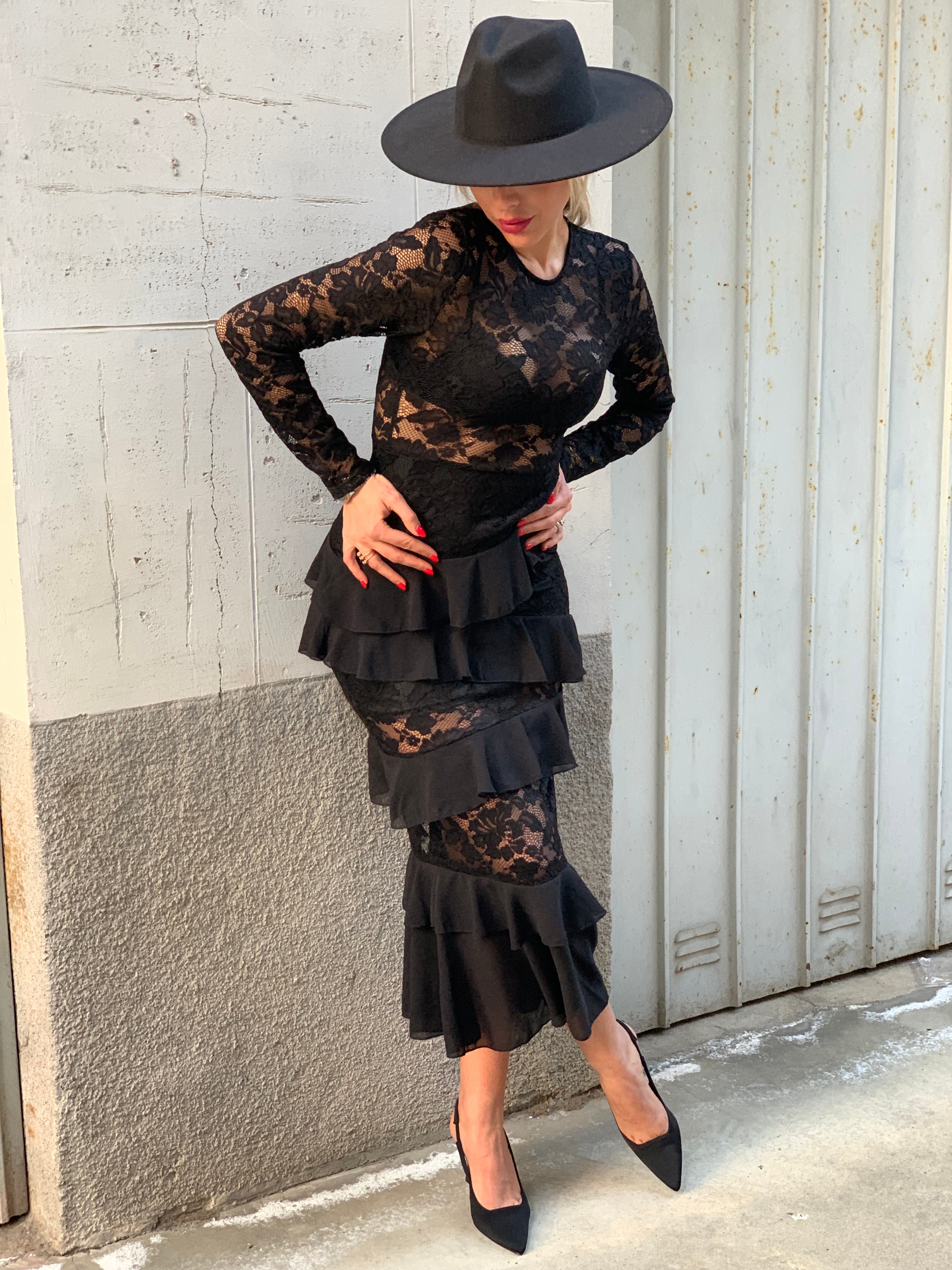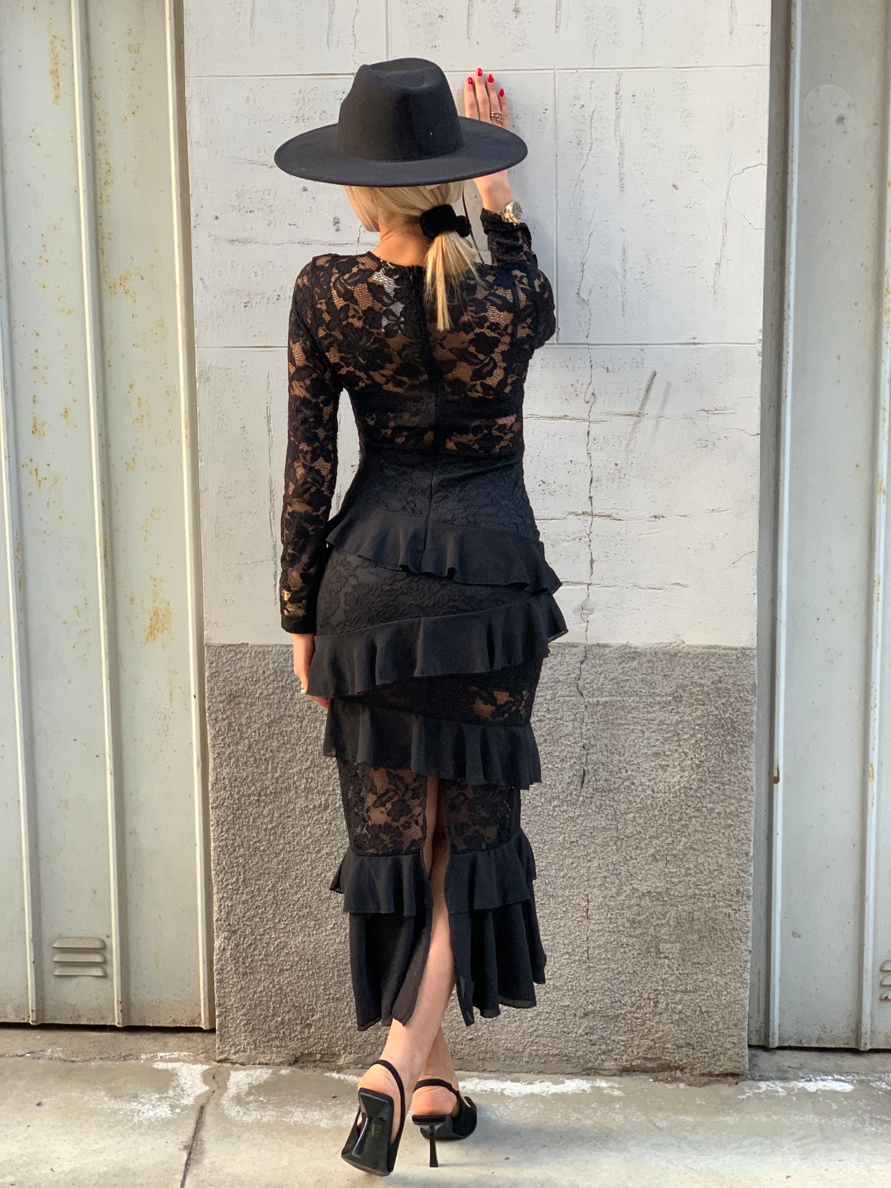 Abito lungo in pizzo trasparente elasticizzato con sottana e volant