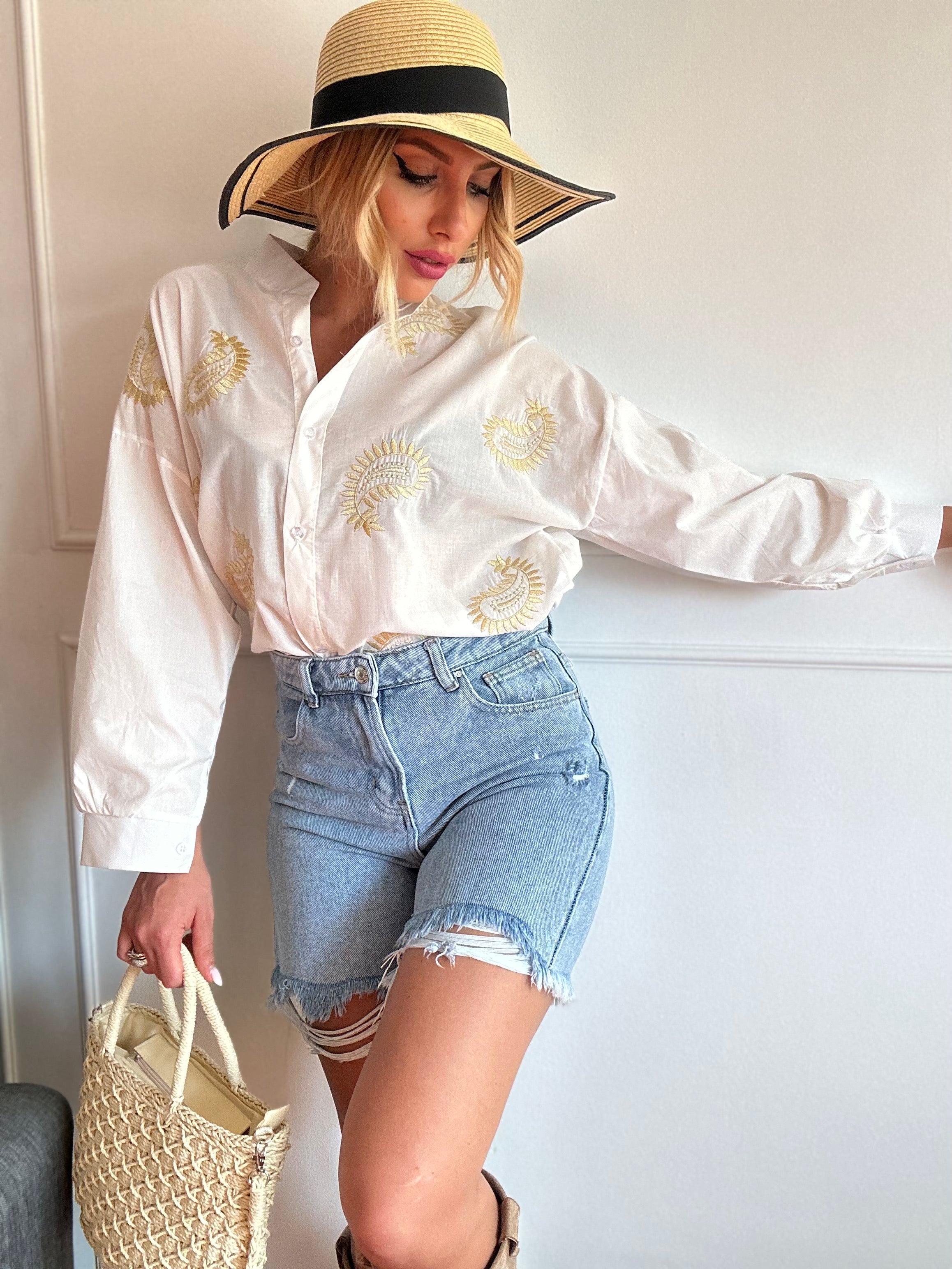 Camicia in cotone ,collo alla coreana,bottoncini e decori beige