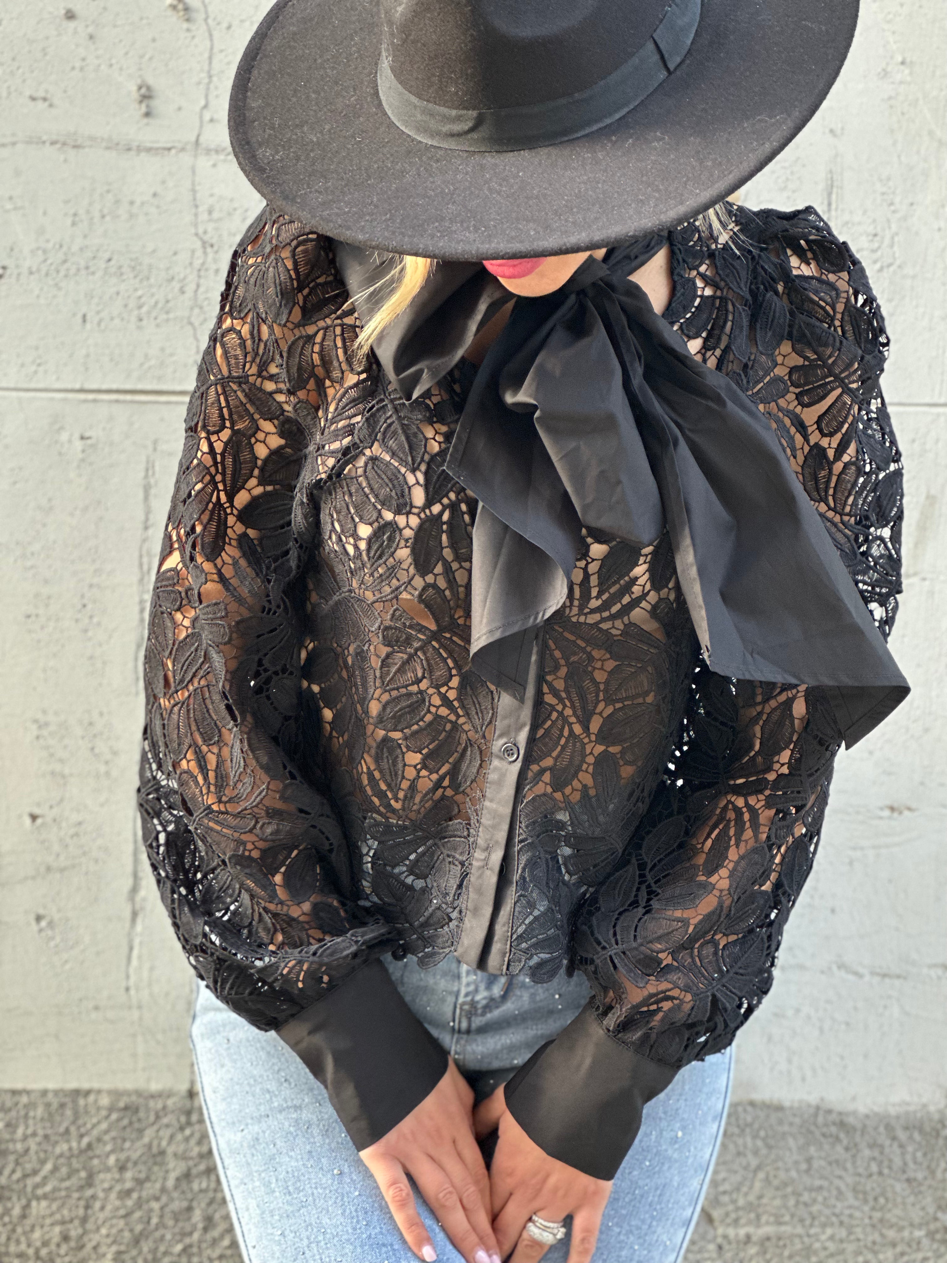 Camicia manica lunga con fiocco grande in cotone sul collo ,intarsiata a foglie , con top da inserire sotto