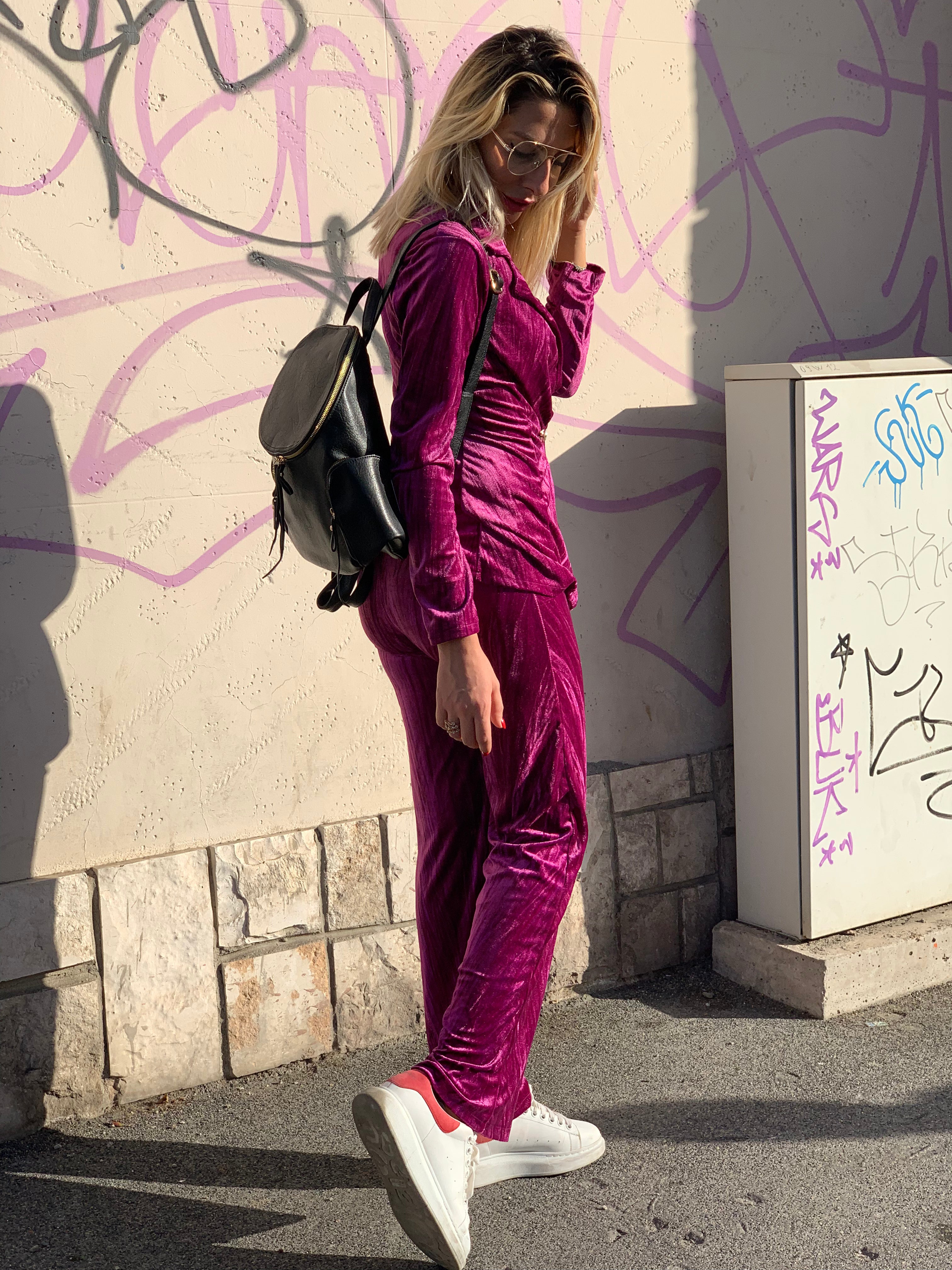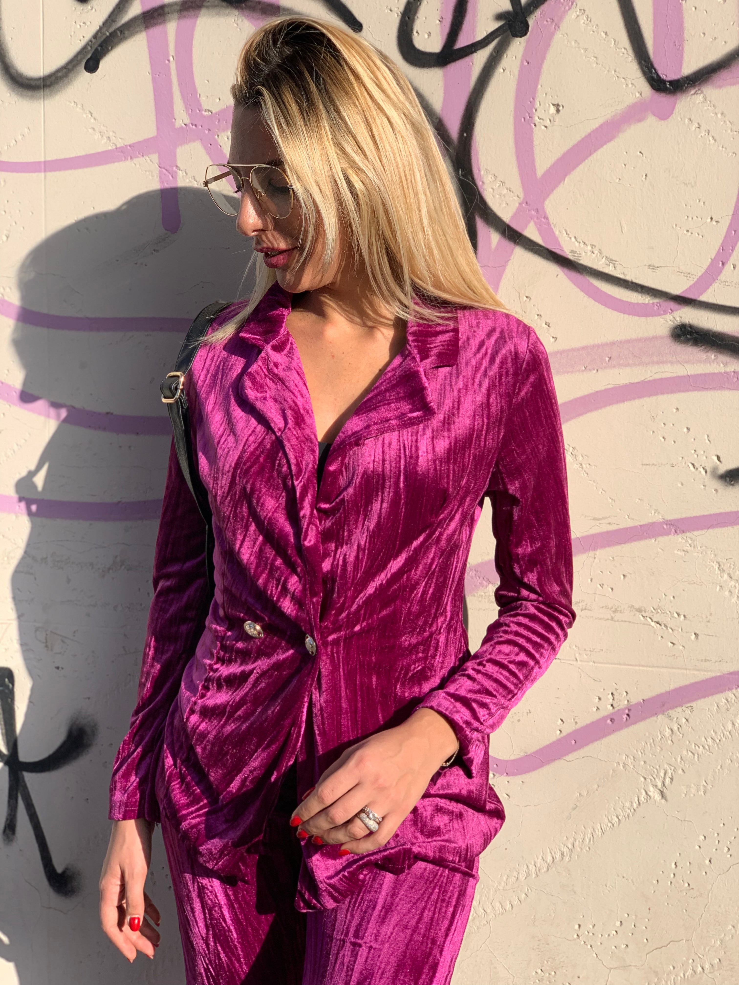 Coordinato camicia/giacca doppio petto bottoni oro e pantalone morbido con elastico in vita in vellutino.