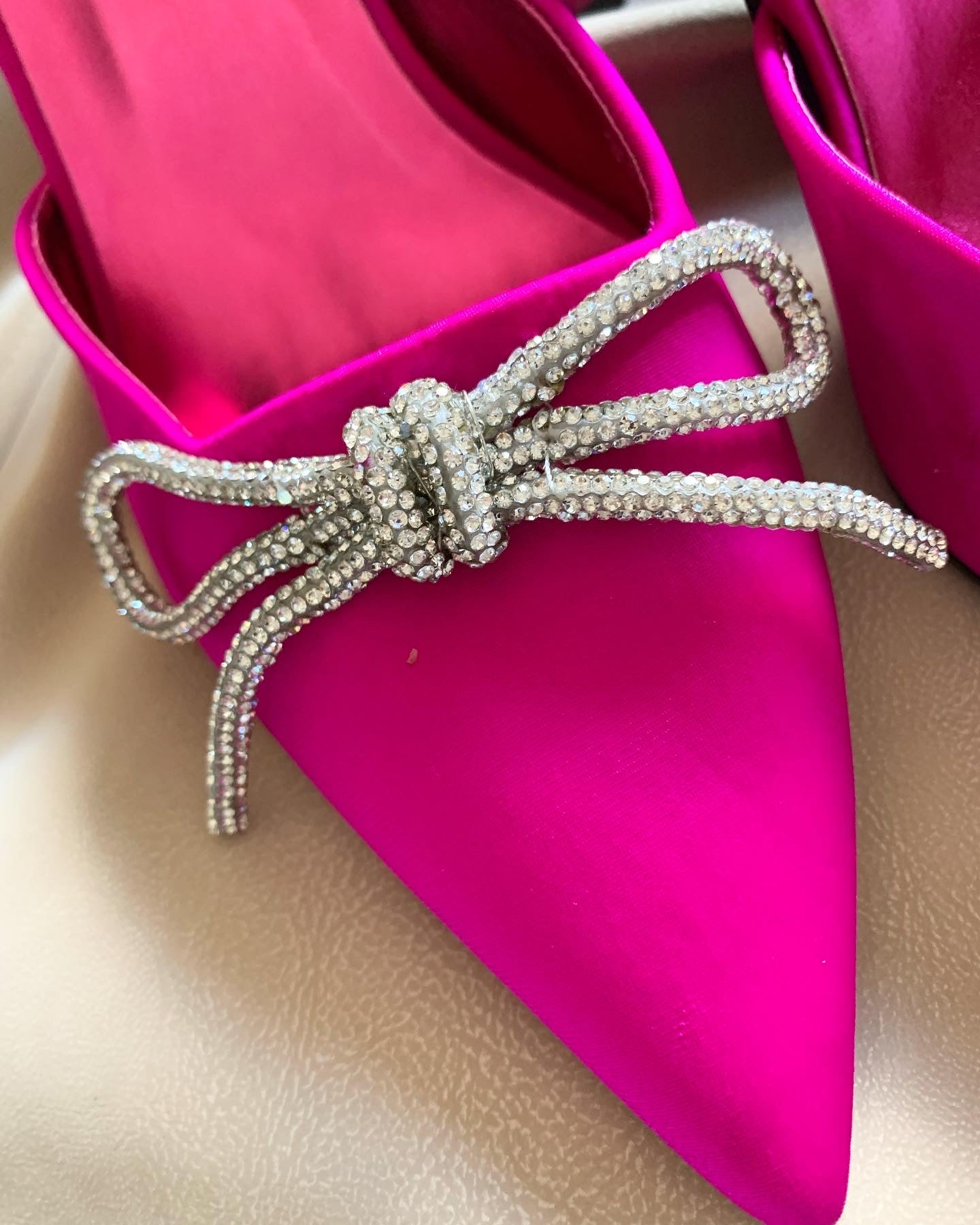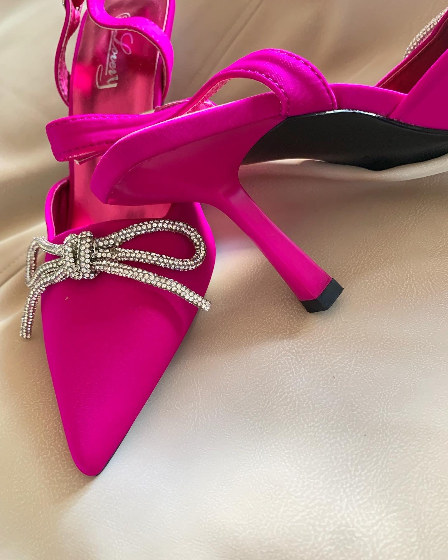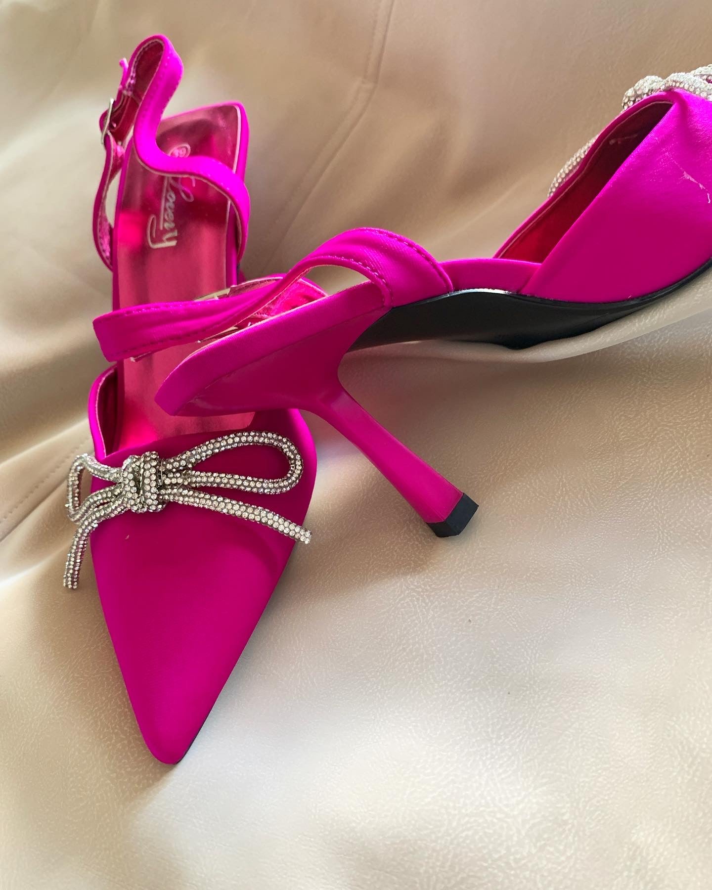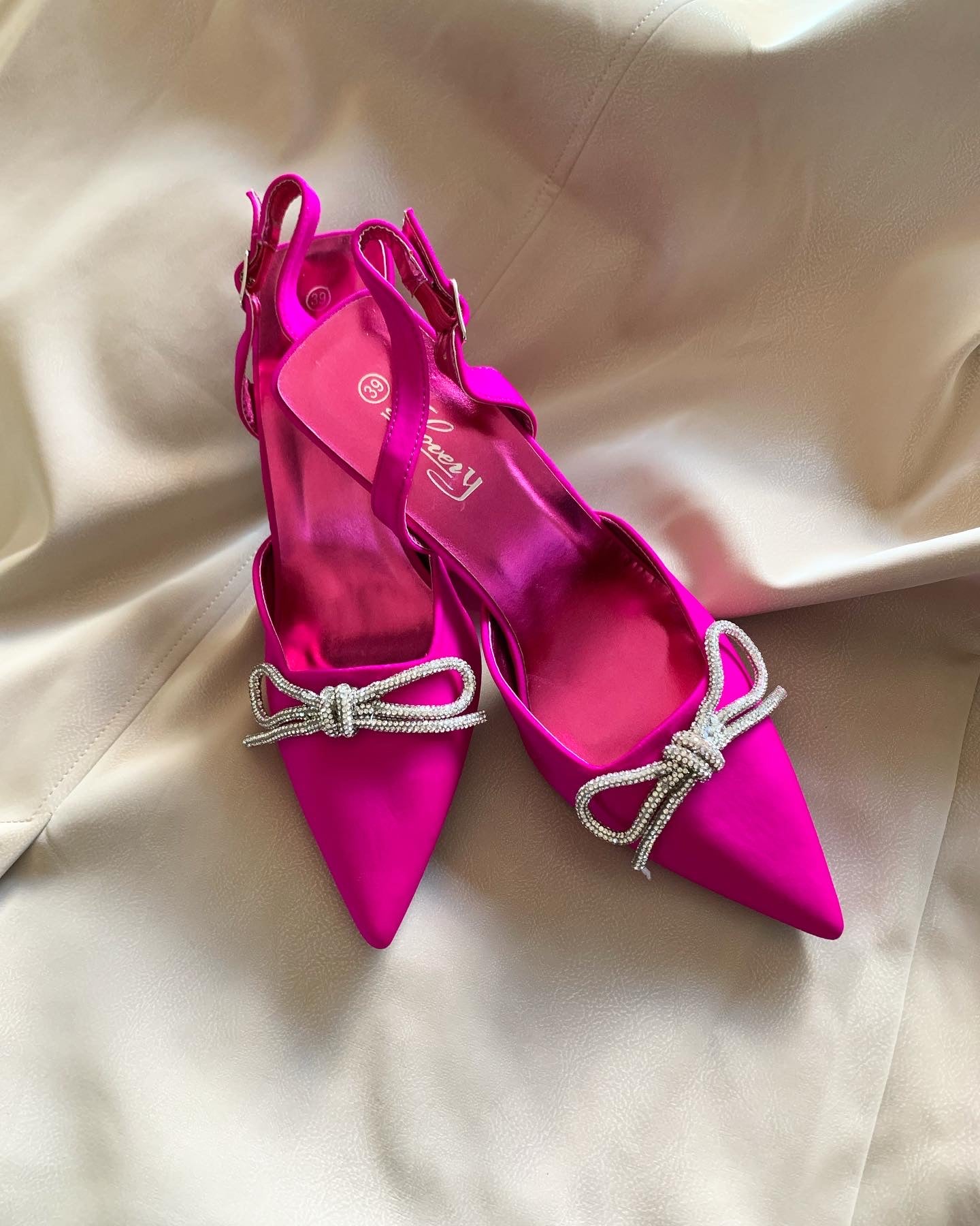 Décolletté in tessuto simil raso ,con fiocco in argento glitter , h tacco 9 cm , aperta dietro, calzata giusta