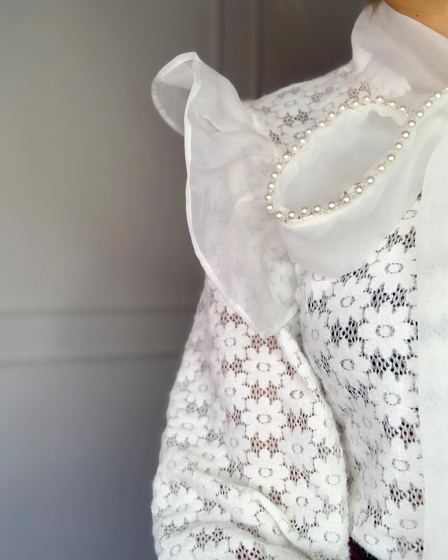 Maglia in pizzo elasticizzato con tulle nelle spalle e fiocco regolabile in tulle e perle