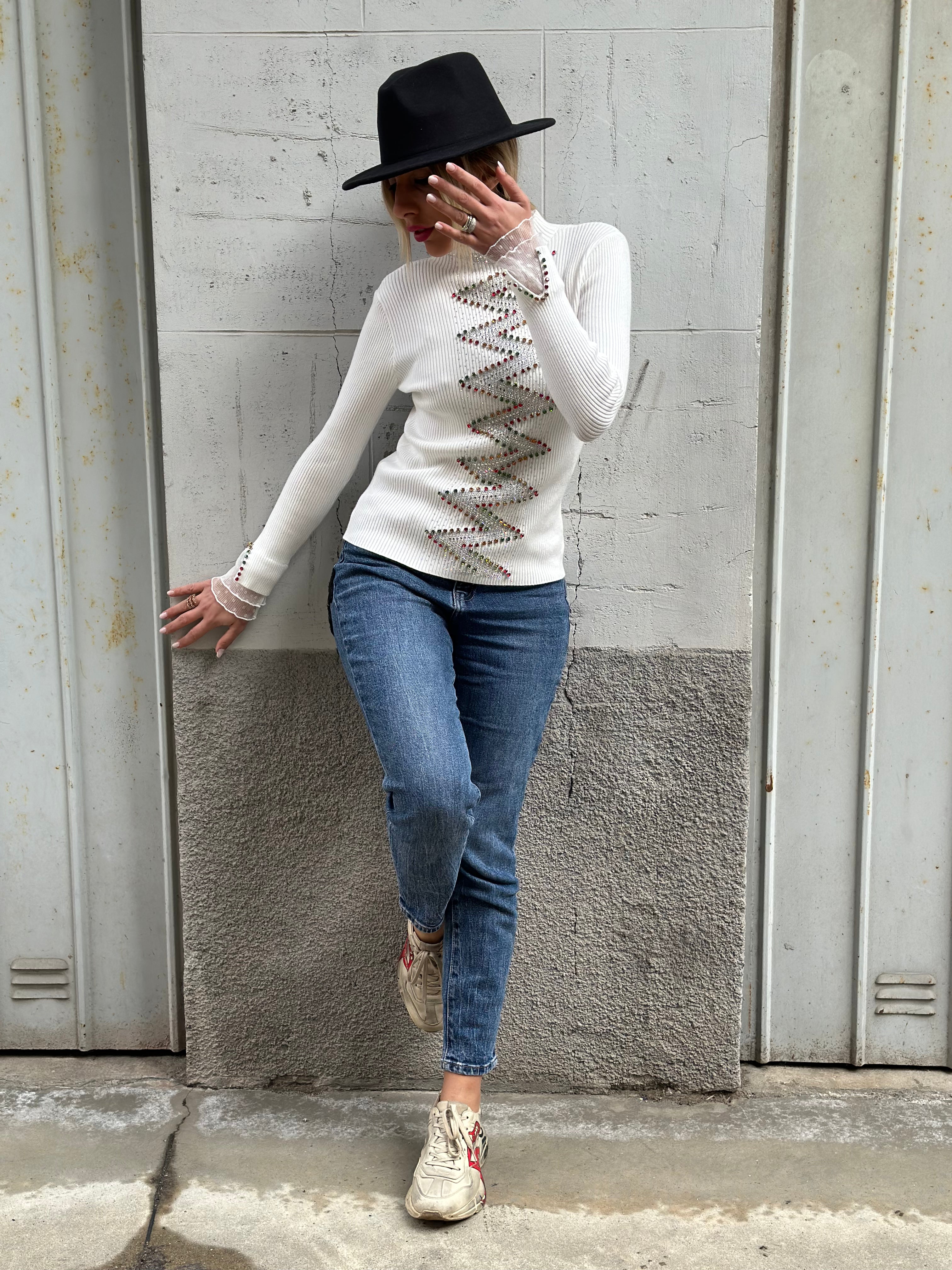 Maglia a costine elasticizzato con strass sul davanti maniche con spacchetto in tulle e swarosky