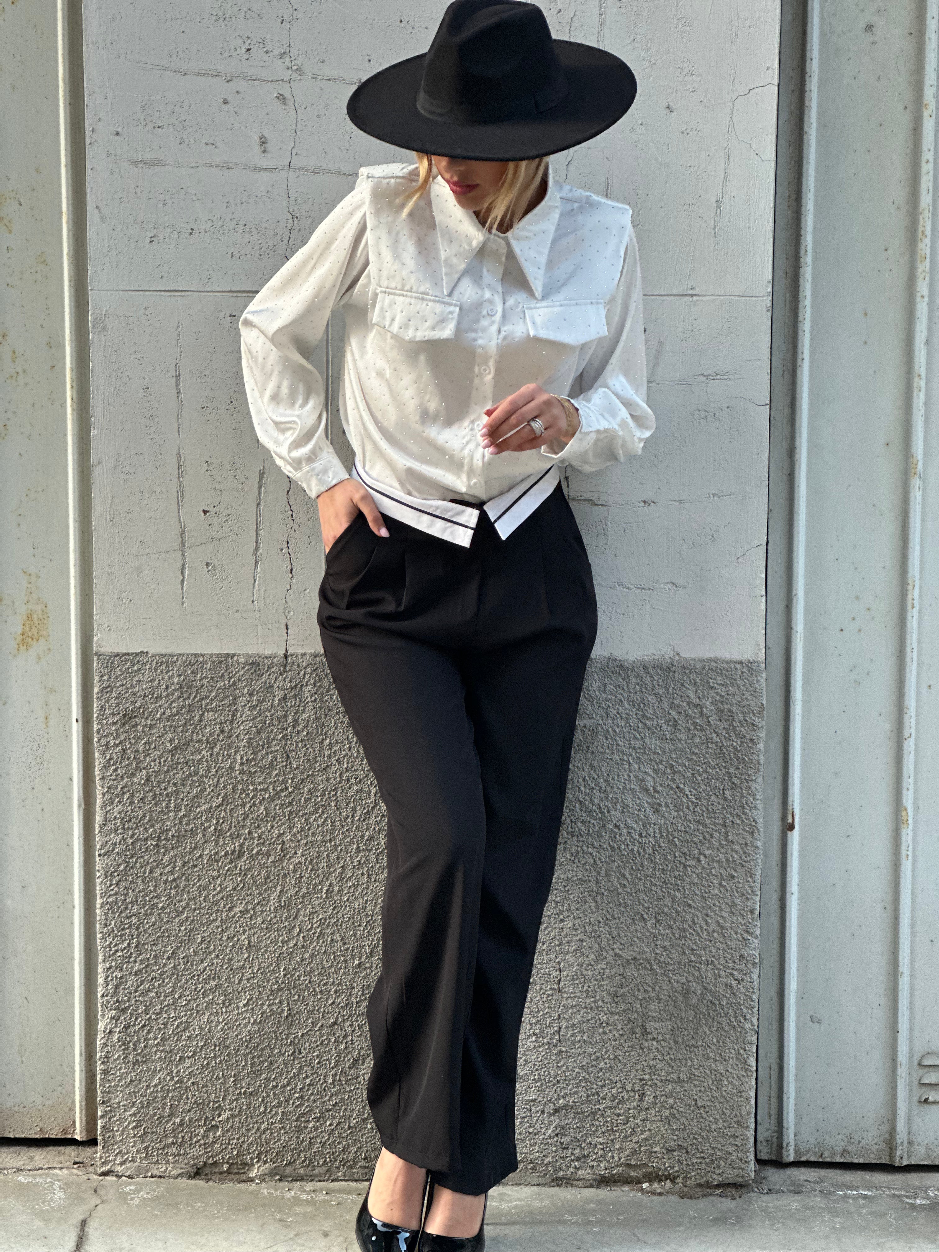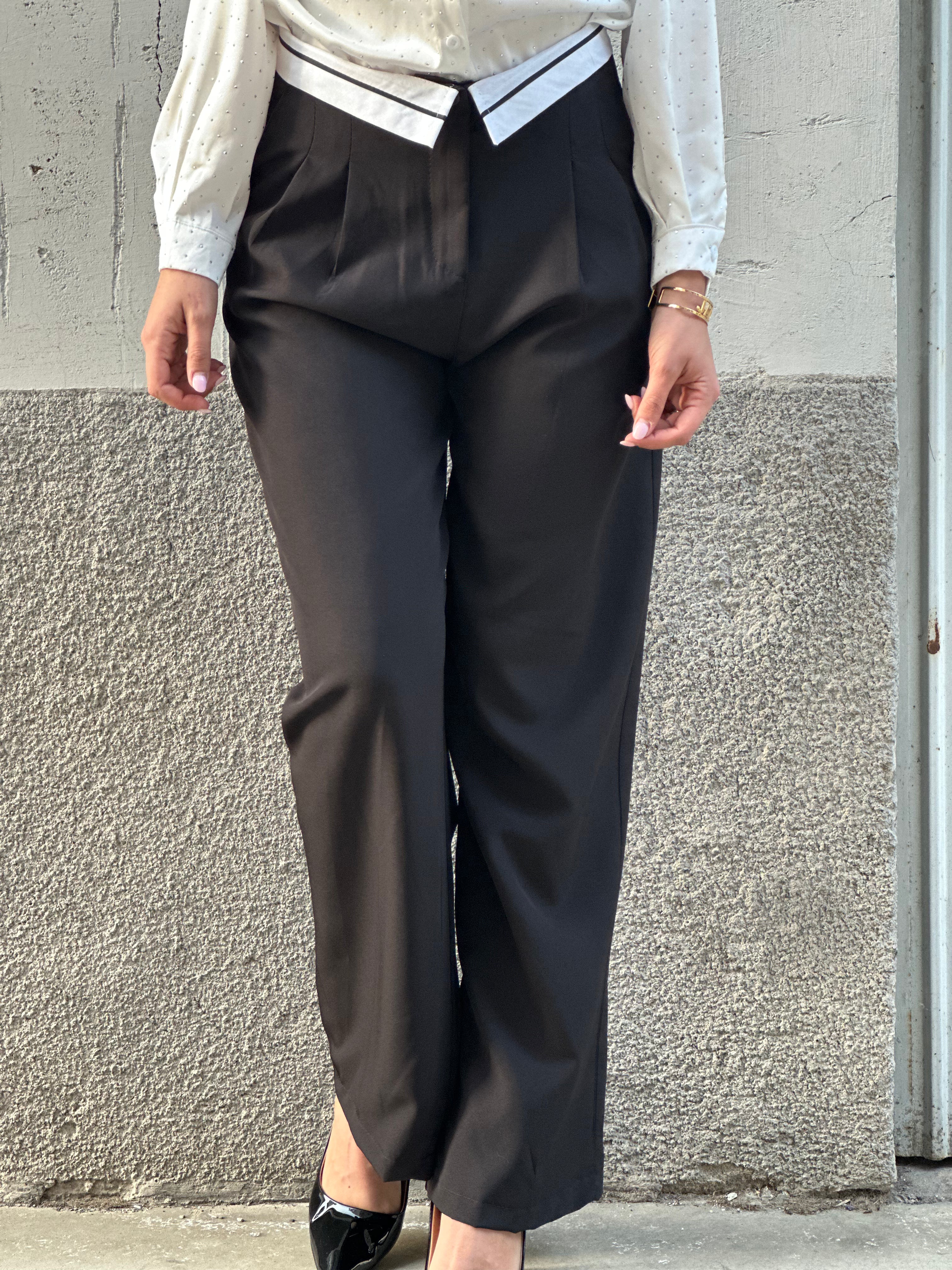 Pantalone largo con pieghe sul davanti e risvolto in vita bianco
