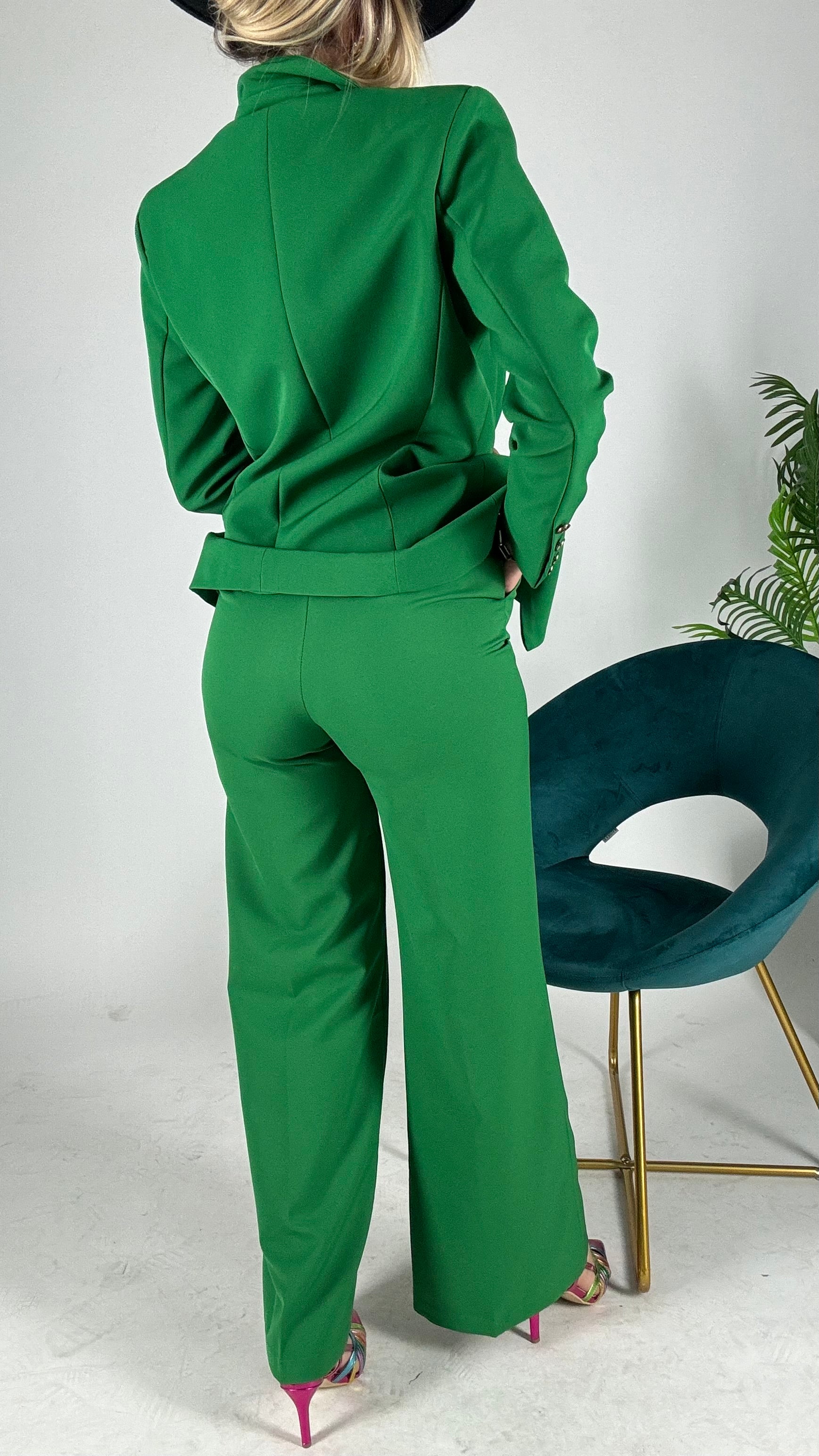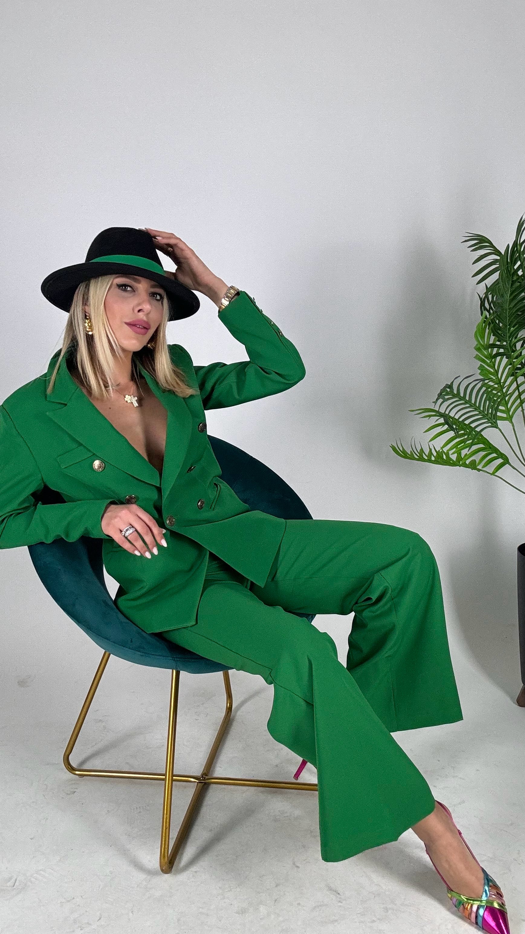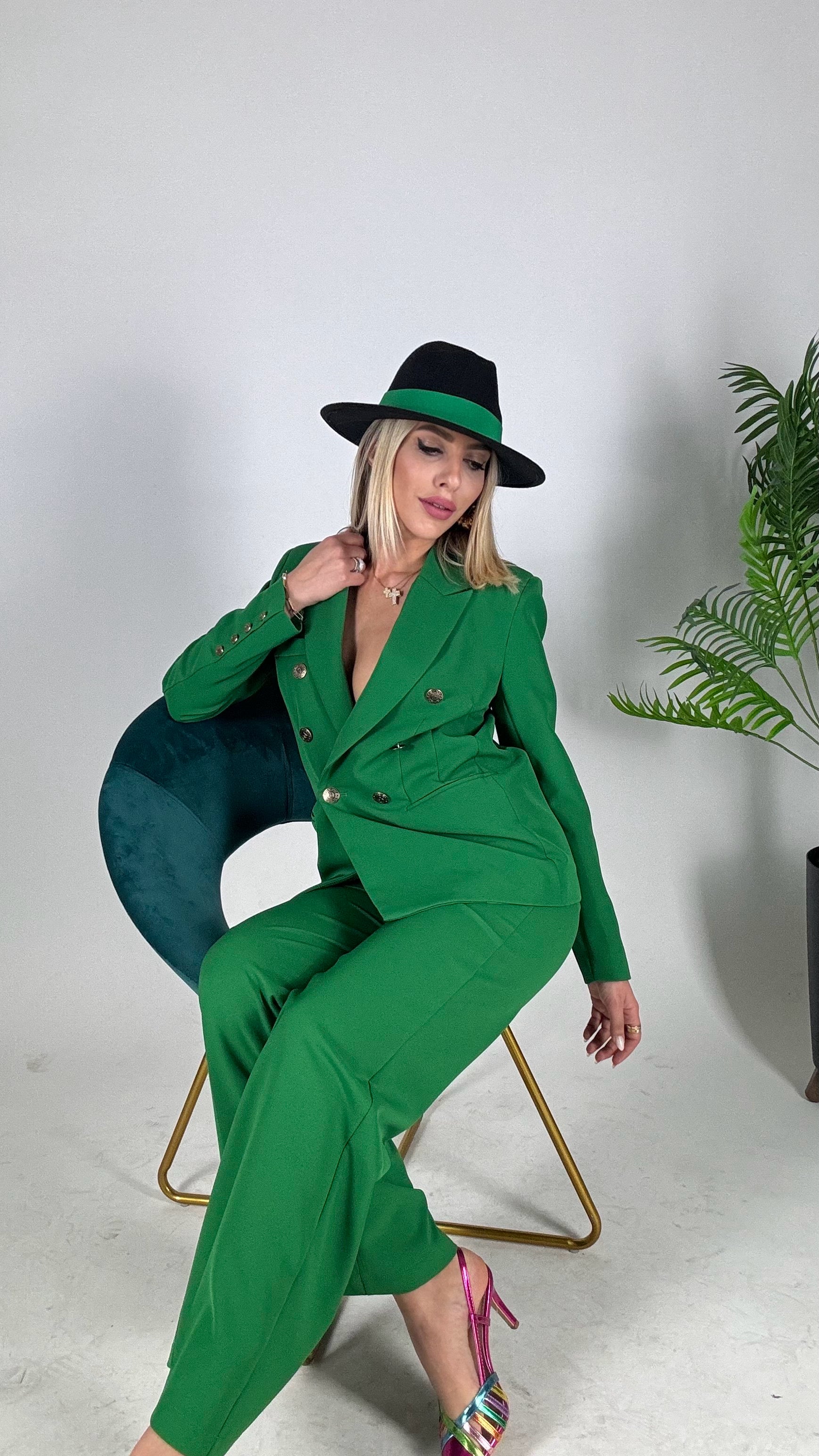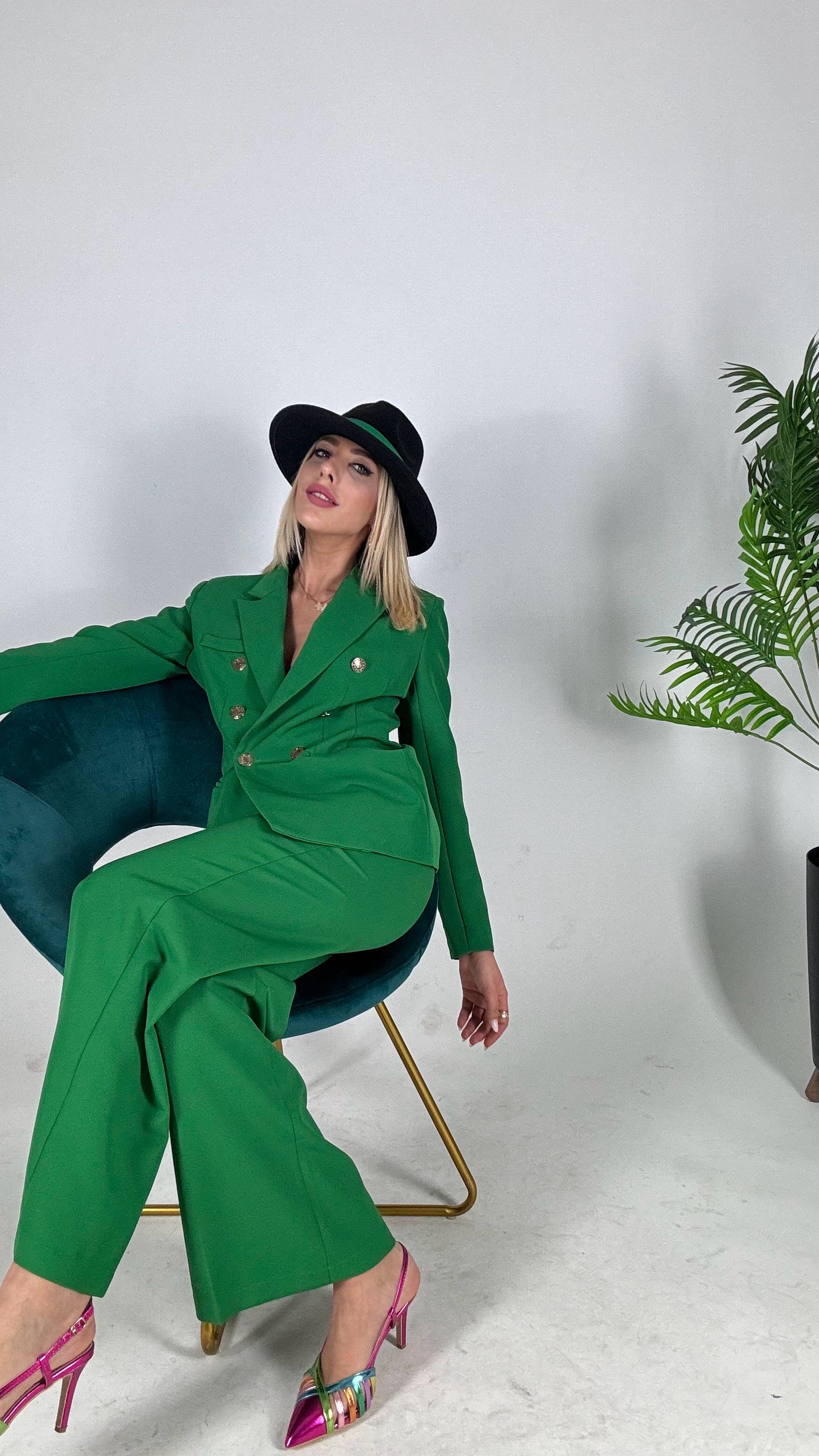 Completo verde composto da giacca doppiopetto con bottoni oro sulle maniche