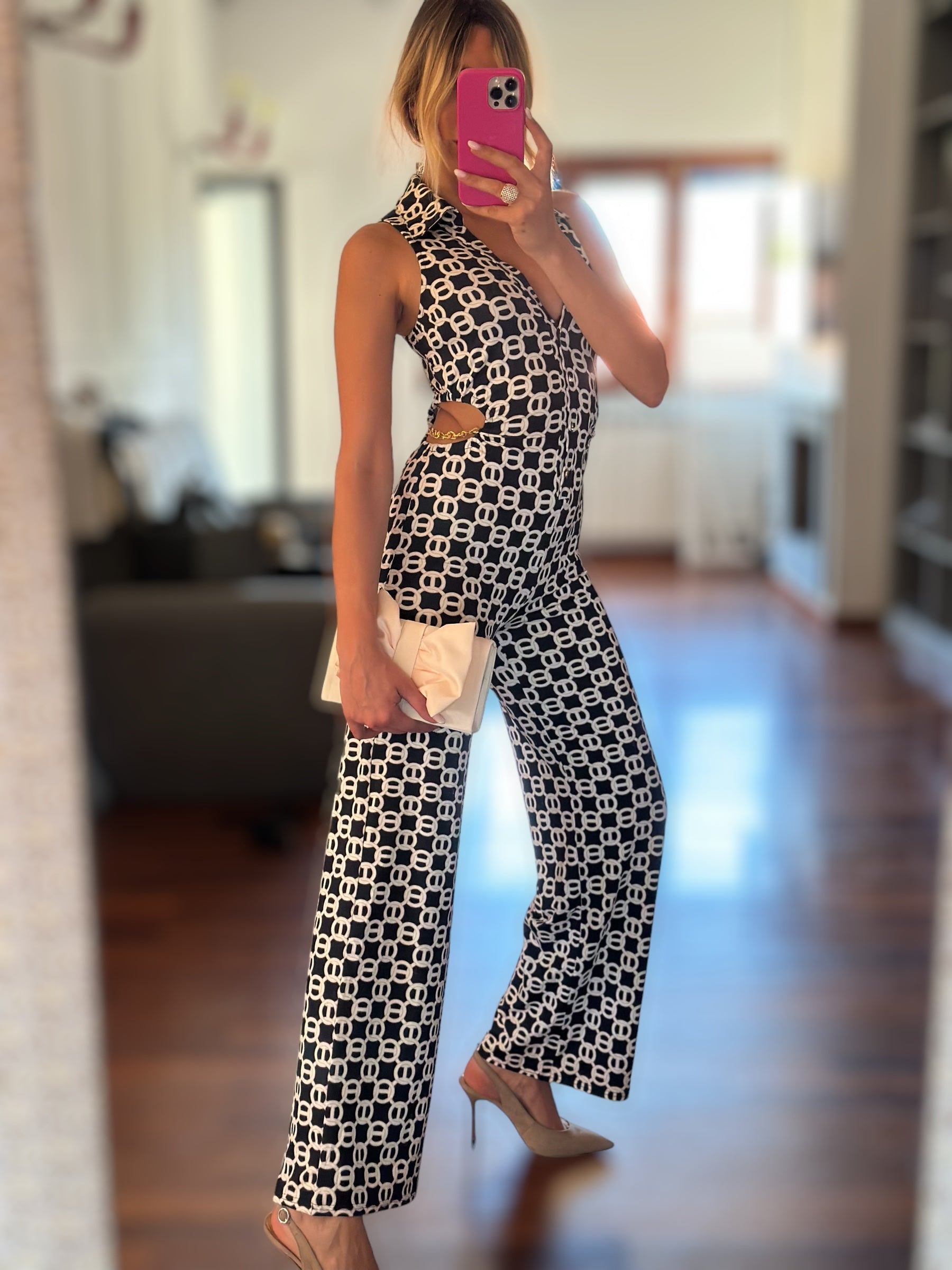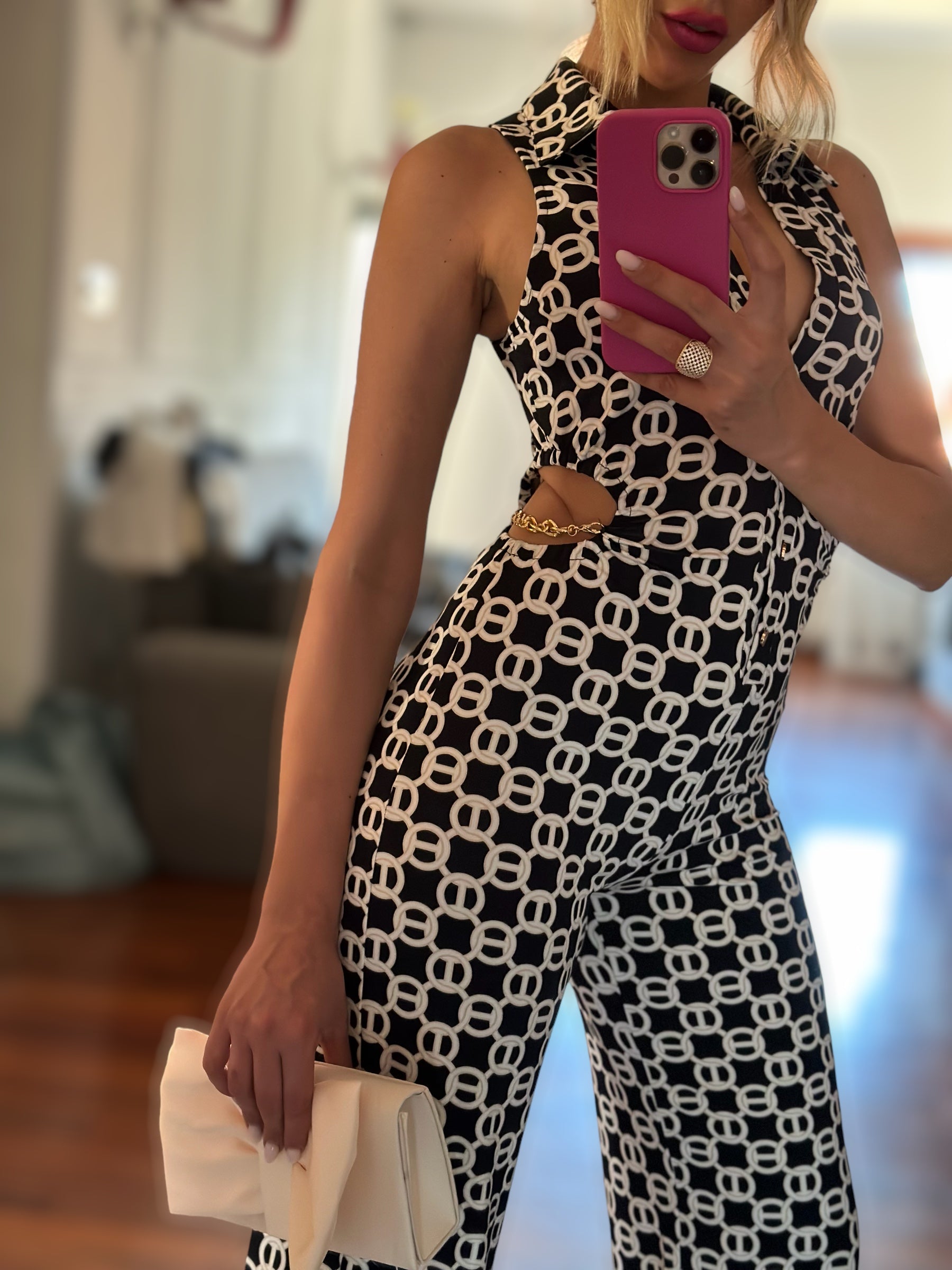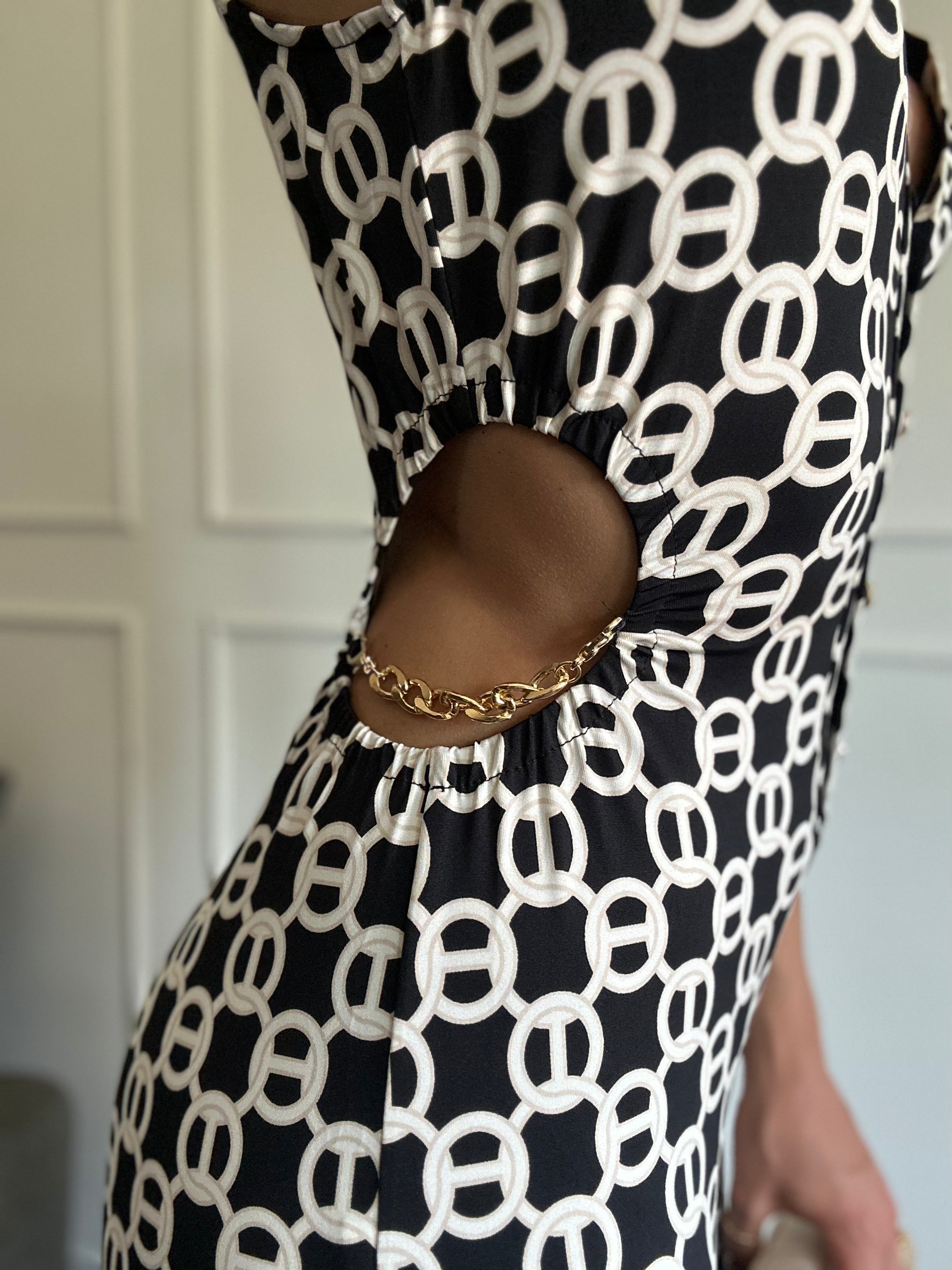 Tuta in licra con fori laterali e applicazione catene oro ,bottoncini oro sul davanti ,elasticizzata,modella indossa tg. S/m è alta 1,75